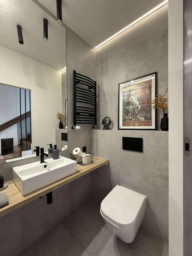 – na parterze znajduje się przestronny salon z kominkiem, półotwartą kuchnią oraz wyjściem na taras i ogród, a także toaleta.