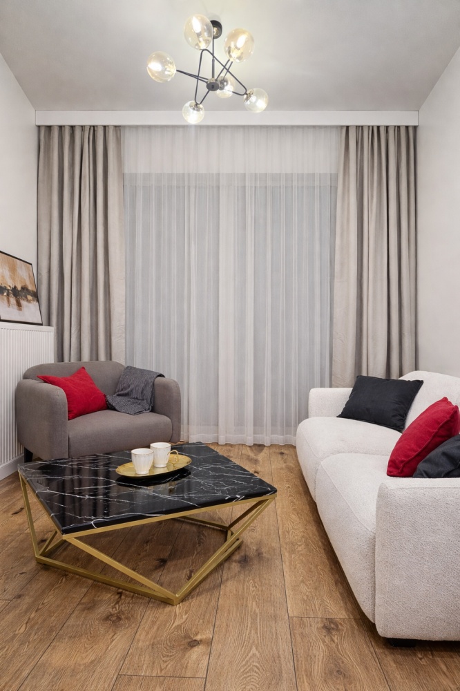 Mieszkanie obejmuje pełną zabudowę meblową w kuchni, przedpokoju oraz w łazience oraz starannie dobrane elementy wyposażenia.W salonie znajdują się designerskie meble, m. in. Sofa marki Gautier o nowoczesnym wzornictwie, dopasowane do charakteru wnętrza.