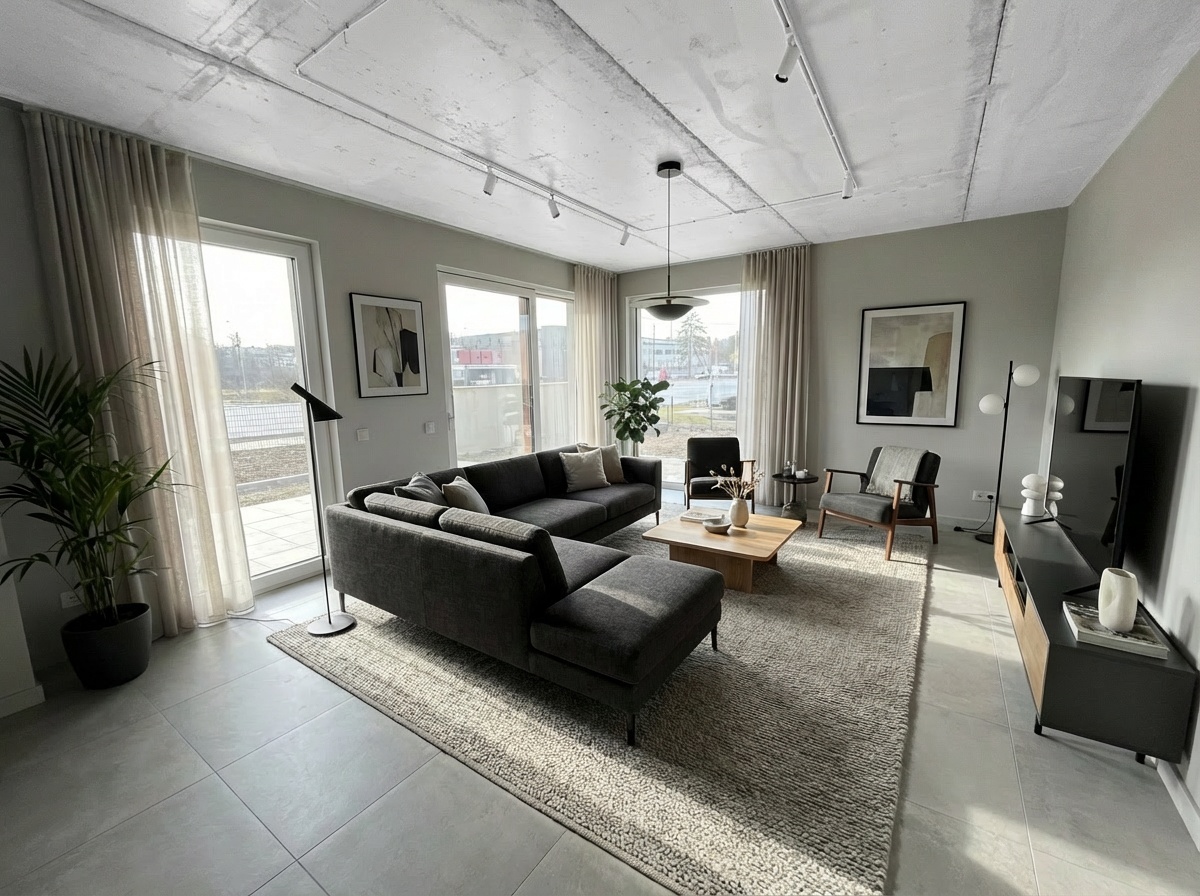 Prezentowane wizualizacje mają charakter poglądowy i zostały wygenerowane przy użyciu narzędzi sztucznej inteligencji. Przedstawiają przykładową aranżację wnętrza i nie stanowią odzwierciedlenia stanu faktycznego nieruchomości ani oferty wykończenia.