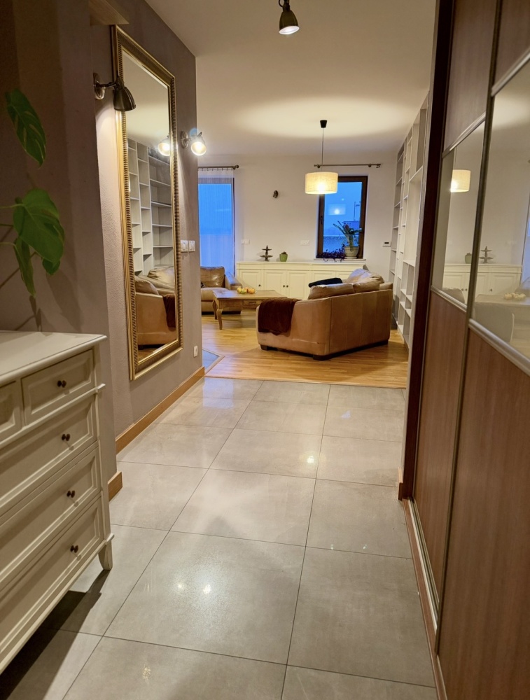 Mieszkanie o powierzchni 100 m2 zlokalizowane jest na ostatnim pietrze w nowoczesnym bloku z windą i garażem podziemnym. Mieszkanie gustownie wykończone z meblami na wymiar.
