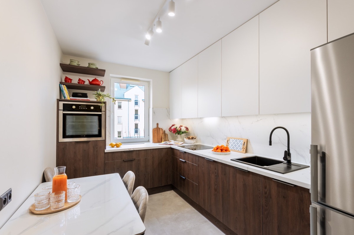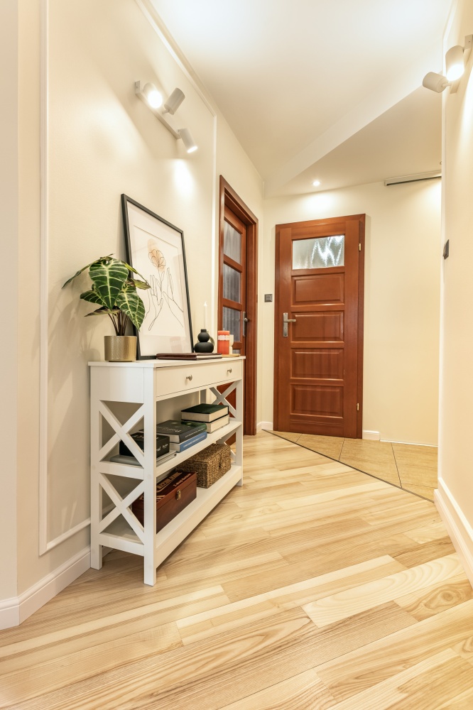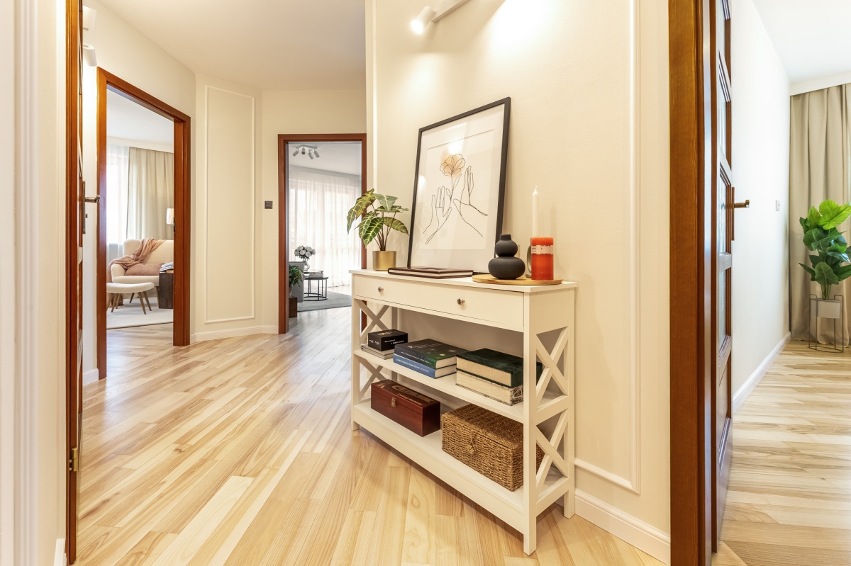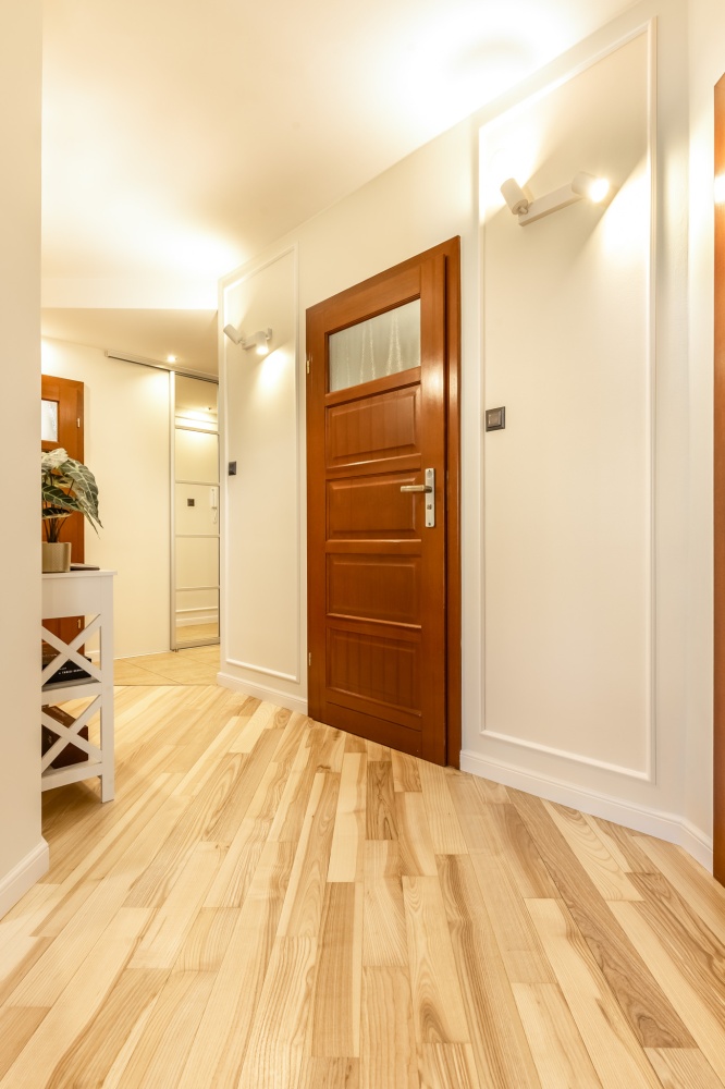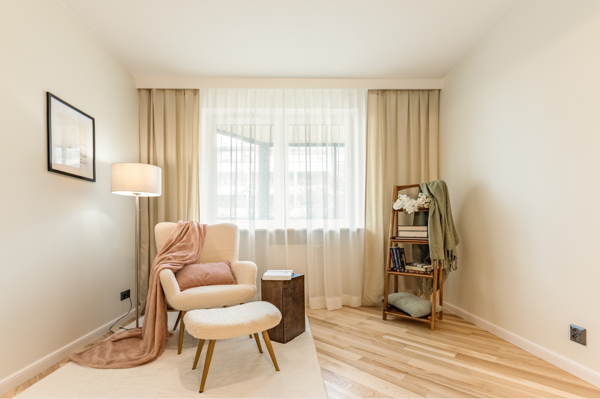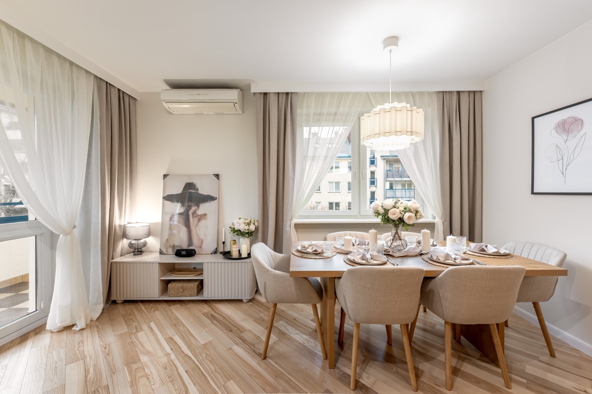 Wnętrza zostały starannie odświeżone — wykonano malowanie ścian farbami Flugger oraz cyklinowanie jesionowego parkietu. Całość uzupełniają pełne, drewniane drzwi Porta, kuchnia w zabudowie na wymiar oraz wyposażenie meblowe salonu i pokoi. Mieszkanie sprzedawane jest z wyposażeniem widocznym na zdjęciach, z wyłączeniem elementów home stagingu.