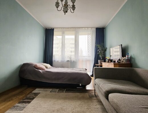 Układ: przestronny salon z aneksem kuchennym (22 m²) z wyjściem na dużą loggię, 3 ustawne sypialnie, łazienka z WC oraz duży przedpokój z szafą w zabudowie. Do mieszkania przynależy piwnica. Mieszkanie dwustronne z widokiem na zieleń, ciche, oddalone od ulicy.