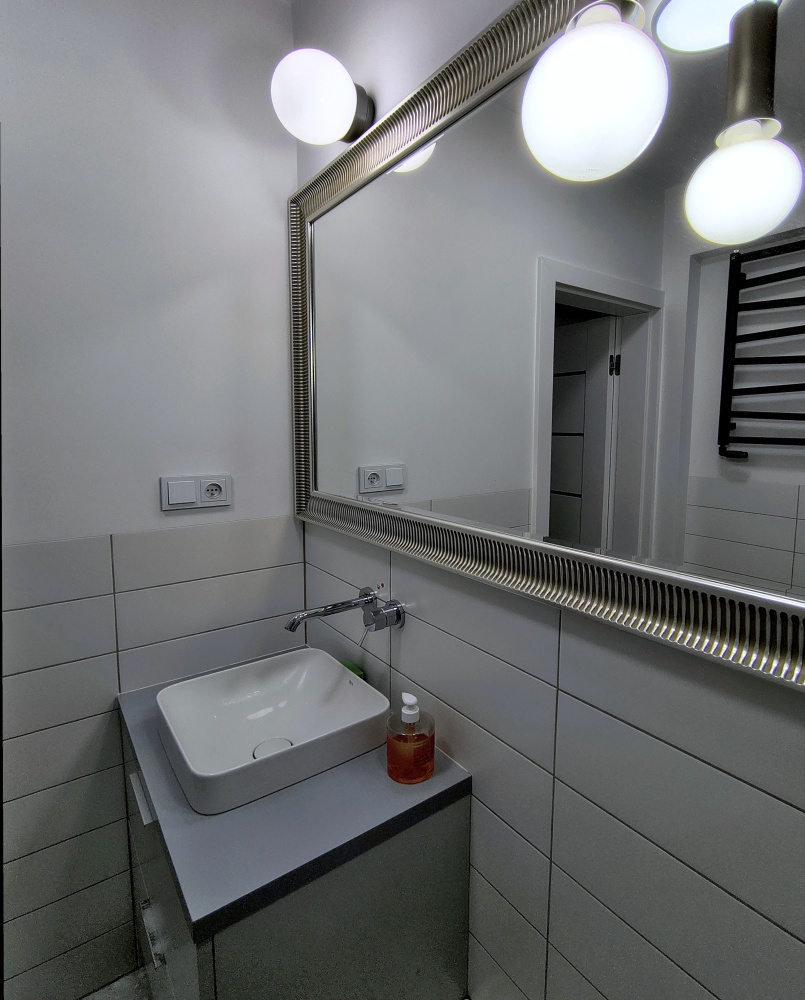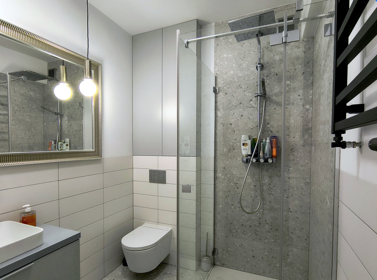 Łazienka (ok. 4 m²): Po remoncie, prysznic z deszczownicą, dużo miejsca do przechowywania.