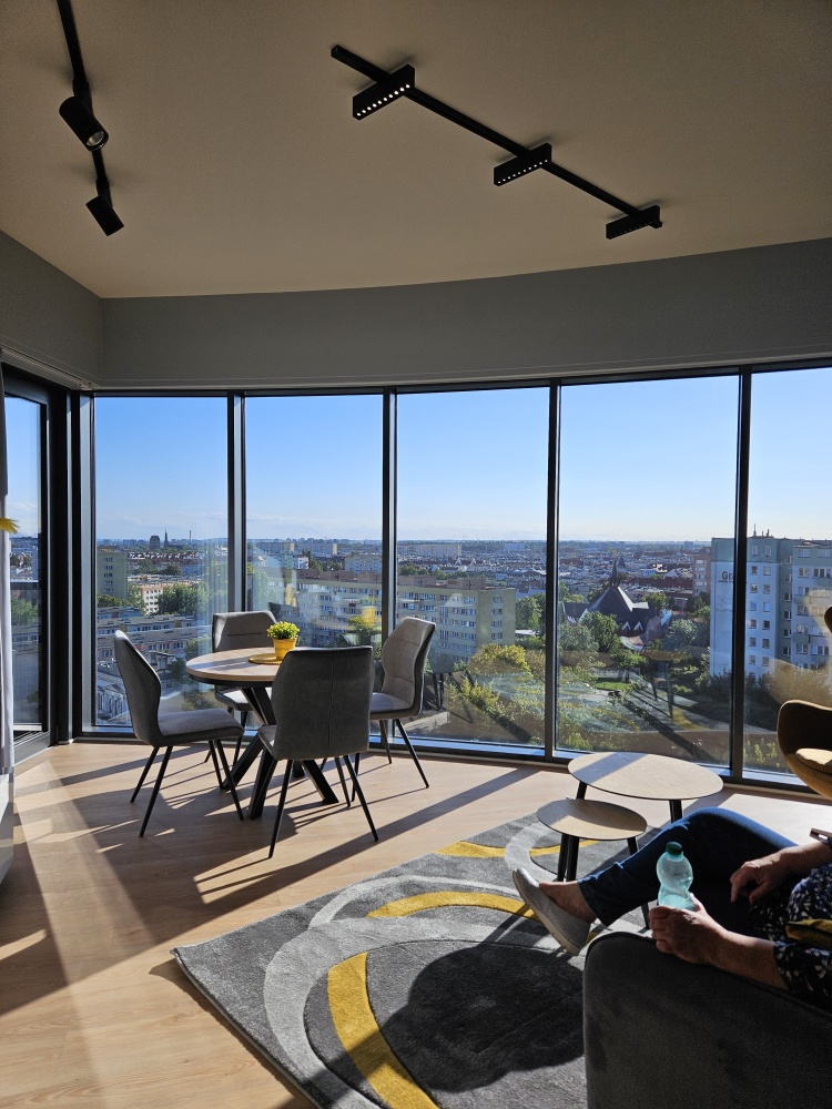 Przestronna, doskonale doświetlona strefa dzienna z panoramicznymi przeszkleniami i wyjściem na loggię. Aneks kuchenny w pełni wyposażony w wysokiej klasy sprzęt AGD, z zabudową wykonaną na wymiar.