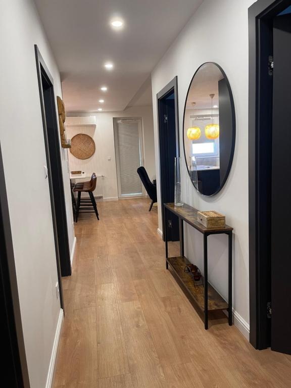 Układ mieszkania uzupełniają dwie komfortowe sypialnie /10.4m2 i 9 m2/ które mogą pełnić funkcję sypialni głównej , pokoju gościnnego lub stylowego gabinetu,garberoby z pralką i suszarką /4,5 m2 /,przedpokój /7.6 m2/iłazienki. /5,6 m2/