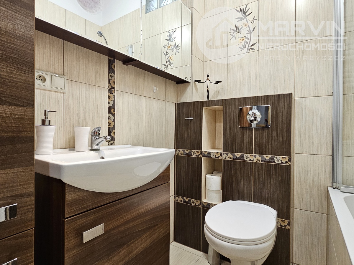 Na 44m2 składają się: umeblowany salon, pokój z wejściem do wyposażonej kuchni, wyposażona łazienka i korytarz z wieloma szafami.