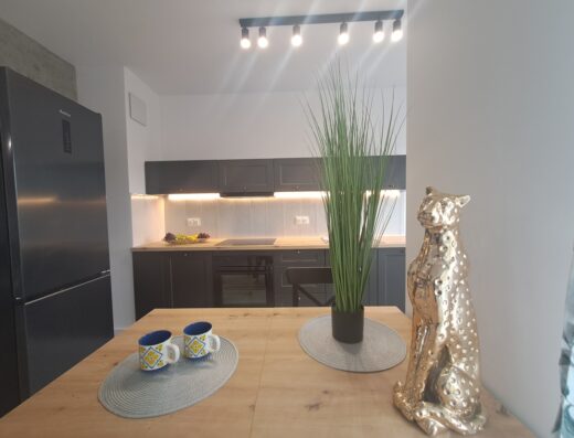 Mieszkanie jest całkowicie umeblowane. W salonie (18 m2) znajdują się: duża rozkładana sofa (niepokazana na foto), 2 szafy wkomponowane we wnęki oraz biurko z krzesłem i lampą stojącą (niepokazane na foto). Balkon jest wyposażony w 2 rozkładane fotele i stolik. W kuchni (8 m2) półotwartej na przedpokój znajduje się zabudowa z pełnym wyposażeniem (lodówka z zamrażarką, zmywarka, płyta gazowa, piekarnik elektryczny, wyciąg) oraz stół kuchenny z 2 krzesłami. W przedpokoju (6.5 m2) znajduje się szafa wkomponowana we wnękę oraz wielkie lustro. Łazienka połączona z WC (3 m2) posiada pełnowymiarową kabiną prysznicową, umywalkę, WC, nową pralkę inwerterową oraz szafki łazienkowe. (Uwaga: przedstawiony w załączeniu rzut mieszkania różni się nieznacznie w zakresie umeblowania).