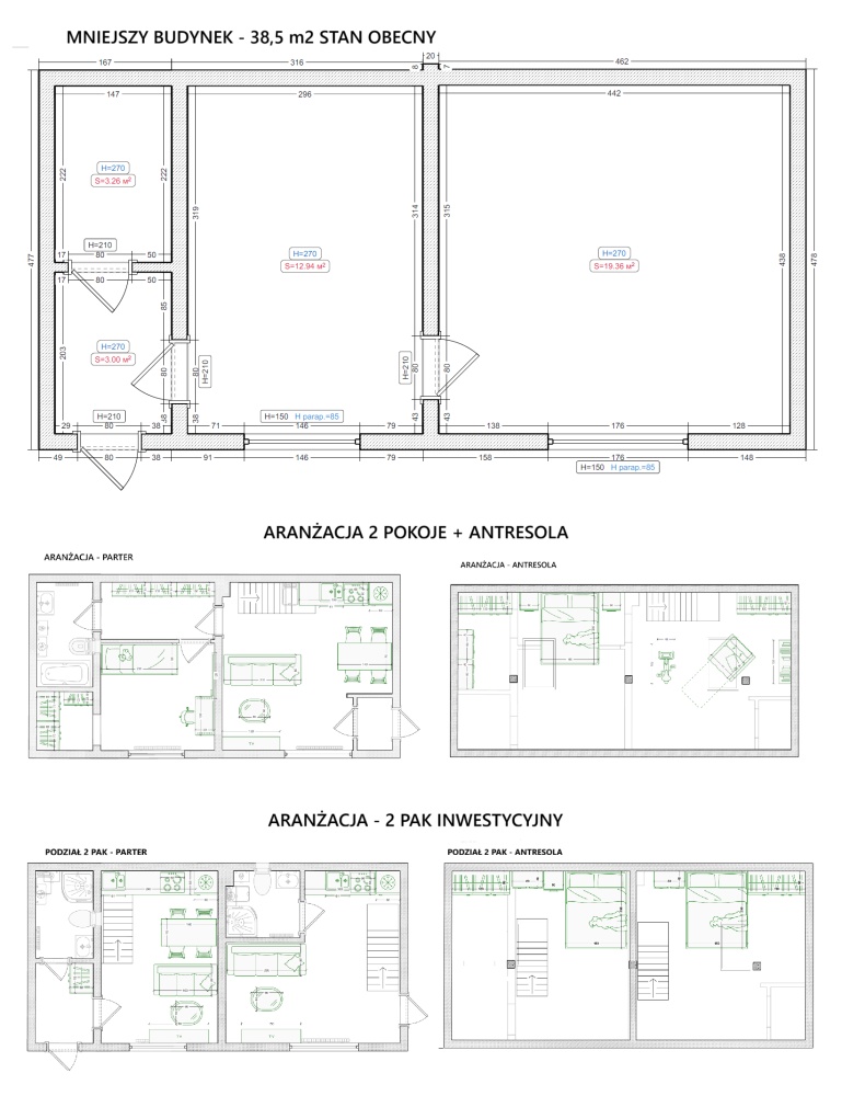 Możliwość zrobienia mieszkań 4 mieszkań dwu pokojowych po ok. 30-32m2 oraz dwóch kawalerek 18m2 z antresolami.