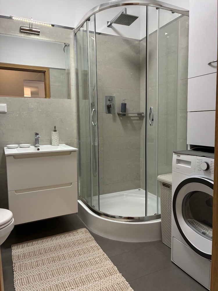 The bathroom features a new shower, washing machine, and automatic dryer.