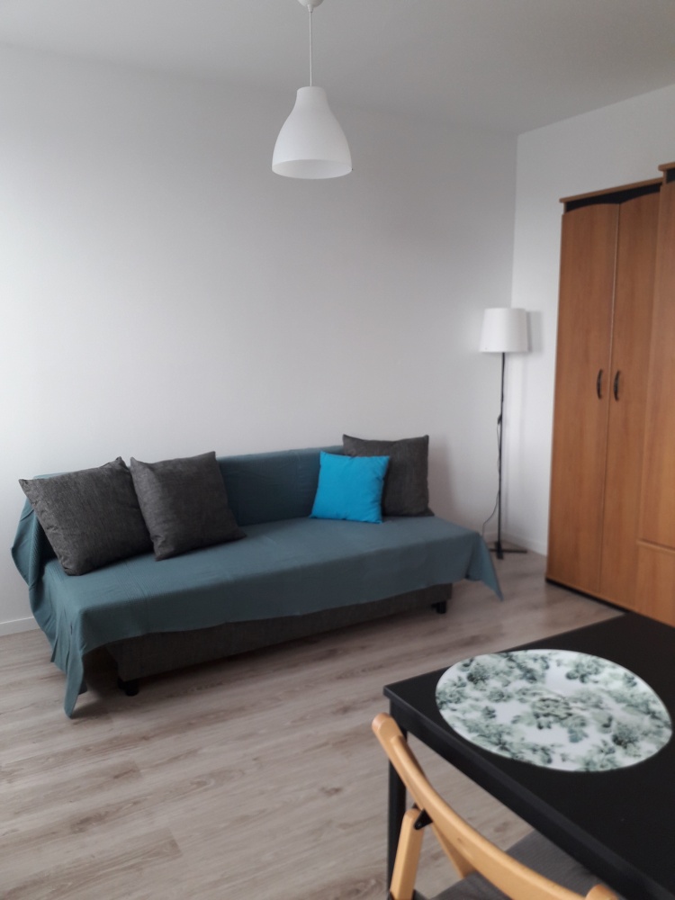 Salon z aneksem kuchennym i urządzona łazienka. Mieszkanie całkowicie wyposażone, do zamieszkania.