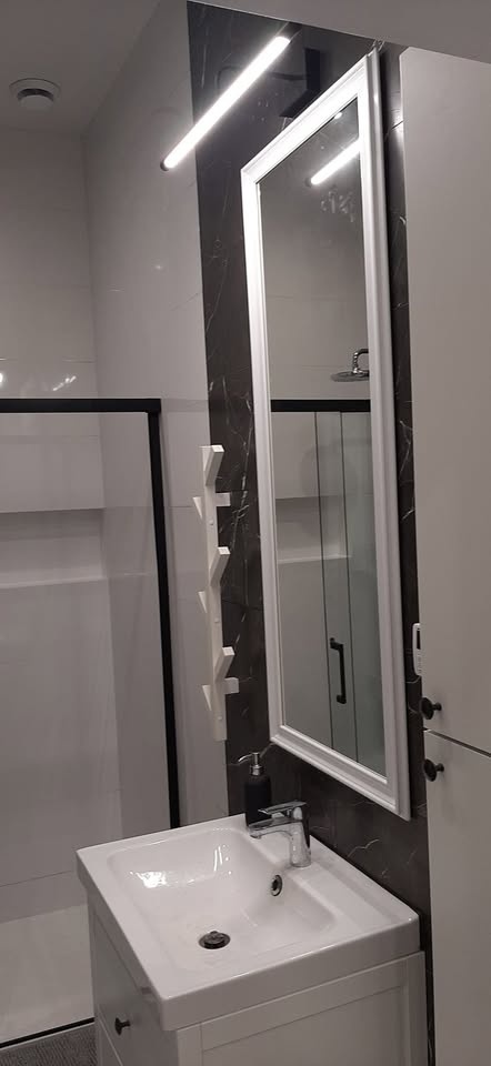 Kabina prysznicowa z drzwiami przesuwnymi,umywalka z szafką,toaleta,suszarka na ubrania,pralka SHARP,kosz na pranie,uchwyty na ręczniki, szafkami wiszące na kosmetyki,wysokie lustro,kinkiet oświetleniowy
