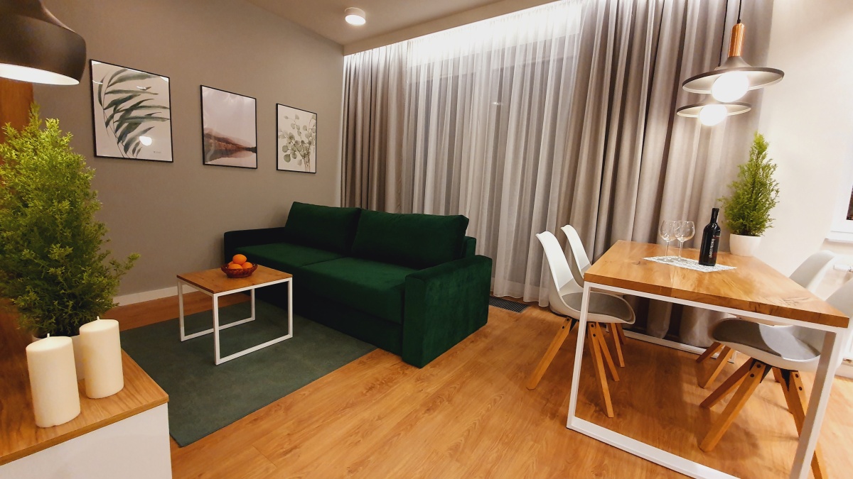 z funkcją spania, stolik kawowy, telewizor, duży stół jadalny. Całość została wykończona pięknymi mięsistymi zasłonami.