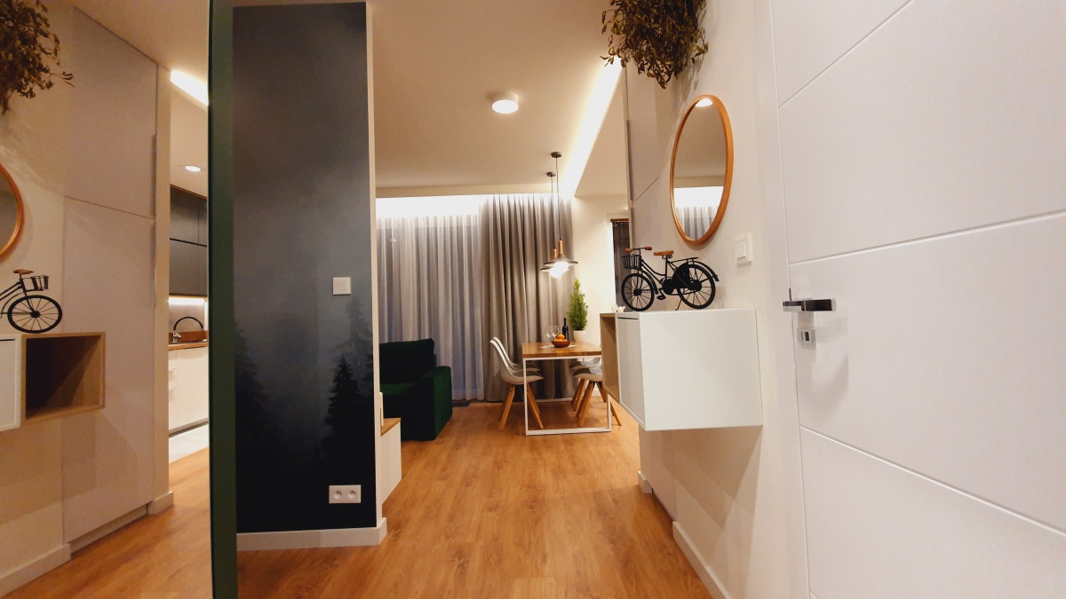 Mieszkanie zostało zaprojektowane i wykończone w taki sposób, aby korzystanie z niego umożliwiało komfortowe funkcjonowanie dla maksymalnie dwóch osób.