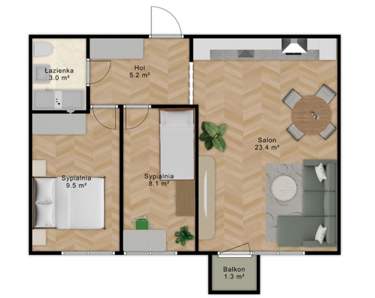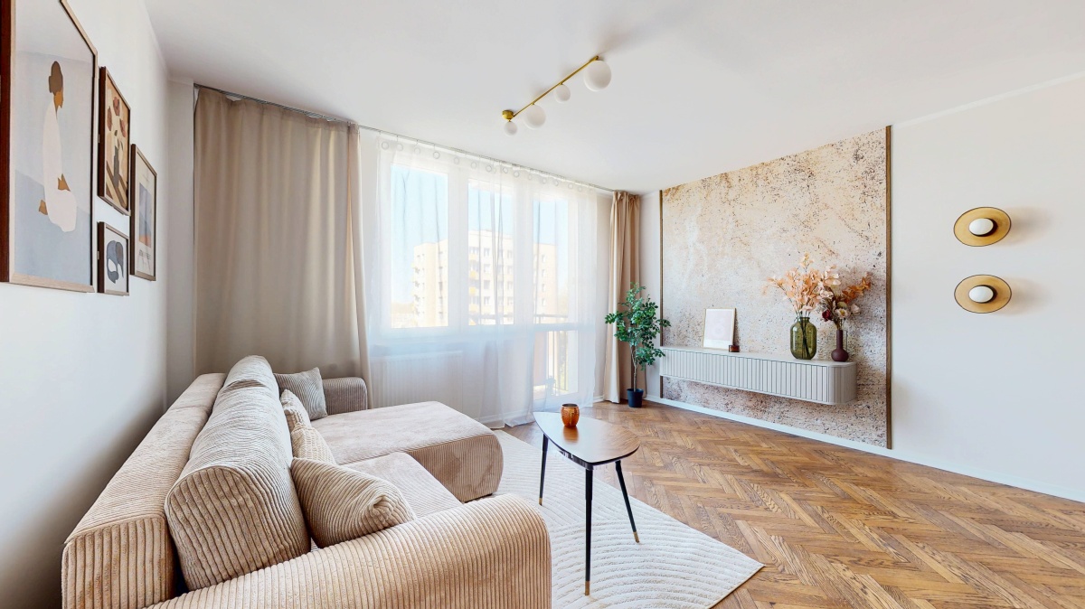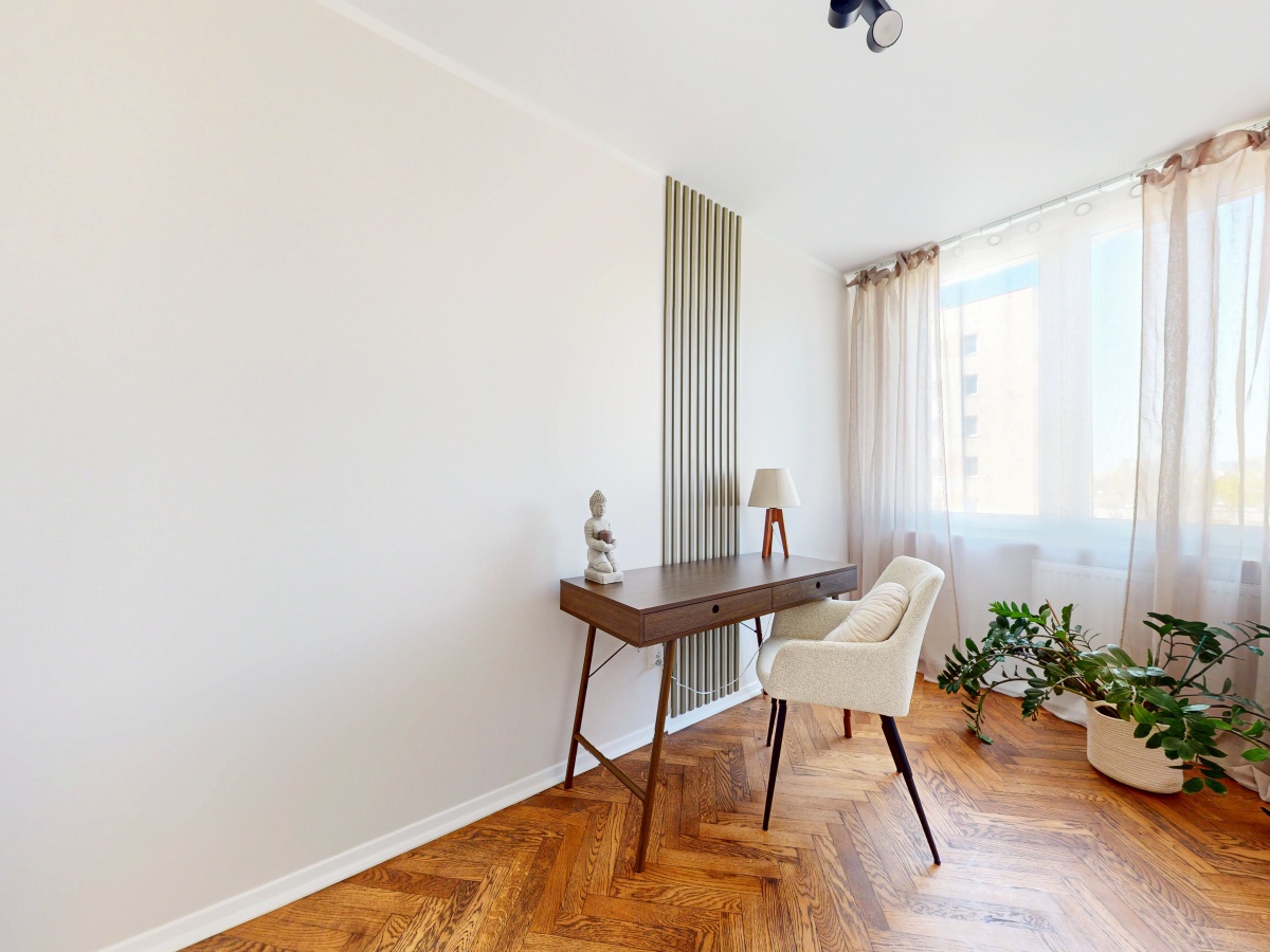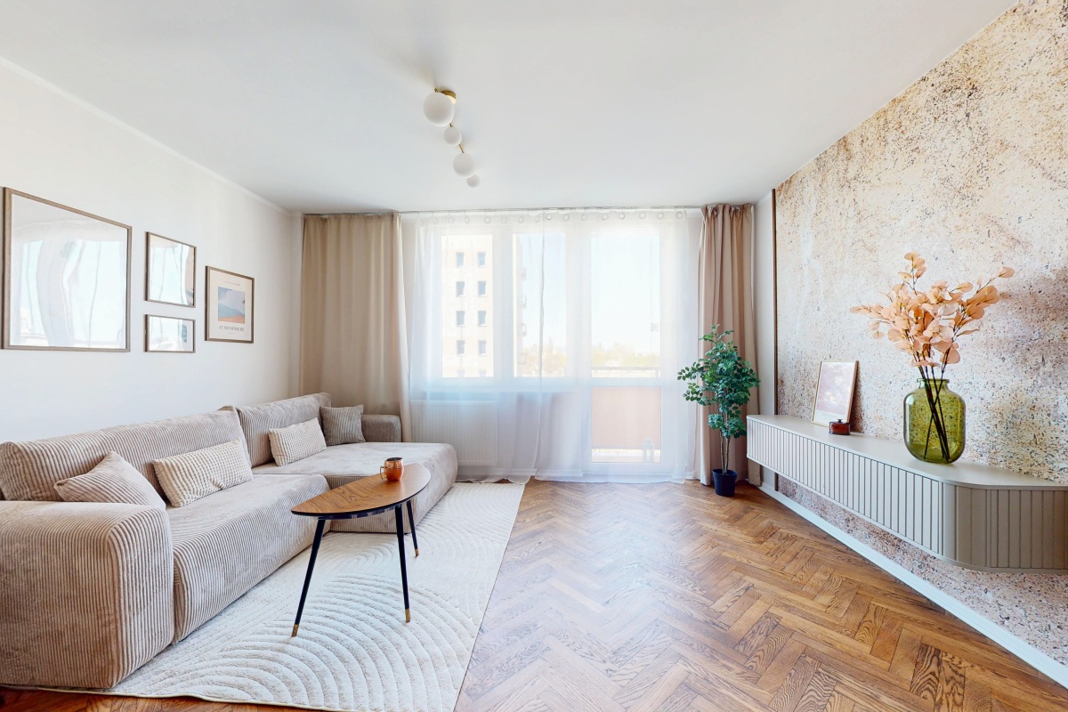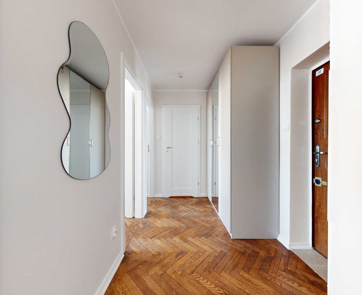 Układ: przestronny salon (25m2) z aneksem kuchennym oraz wyjściem na balkon, sypialnia (10m2), mniejszy pokój (8m2), łazienka (3m2) oraz przedpokój z szafą(5m2). Do mieszkania przynależy piwnica. Mieszkanie jest ciche, z ekspozycją zachodnią, położone na 7 piętrze – piękny widok na panoramę warszawskich wieżowców.