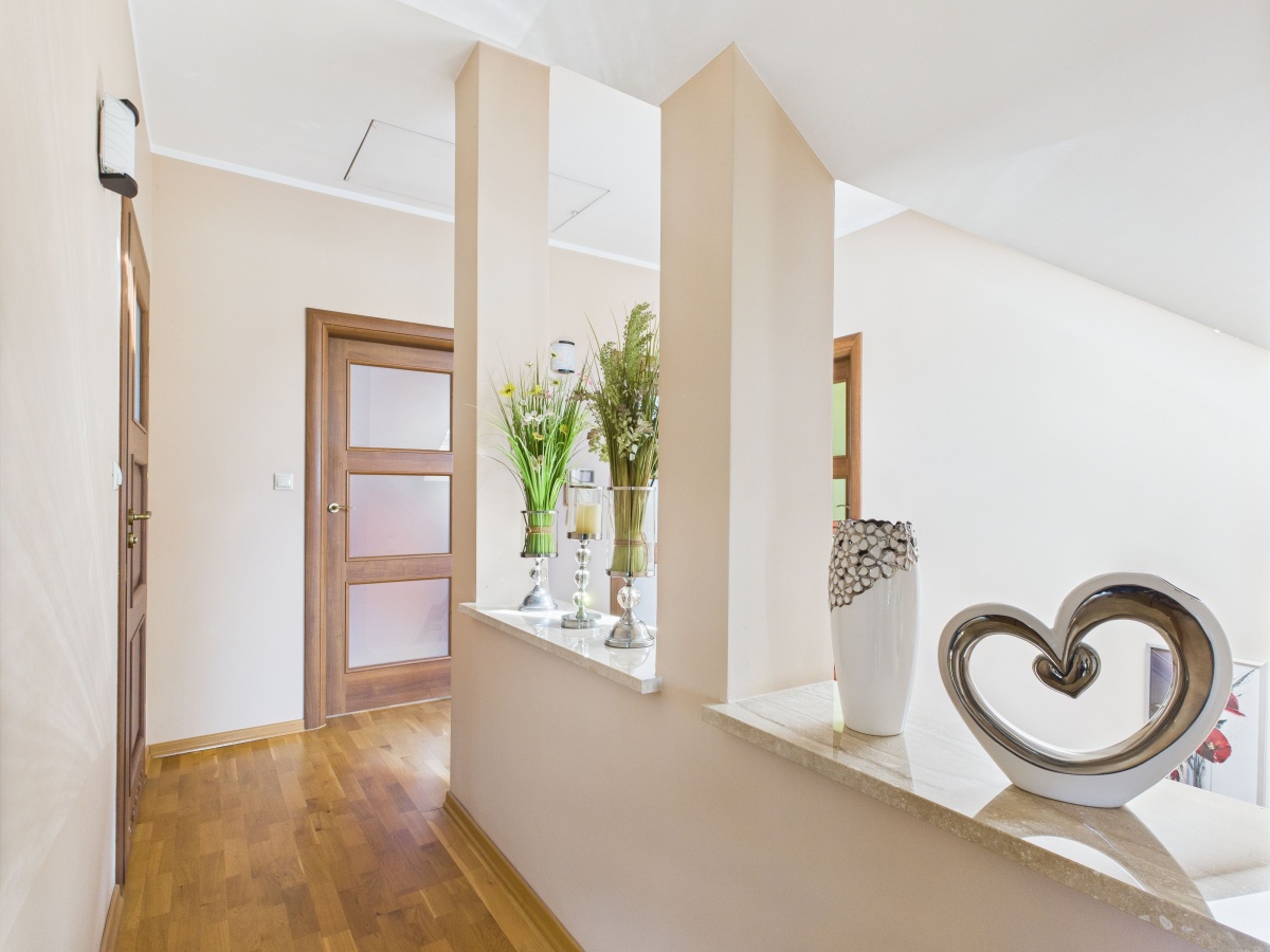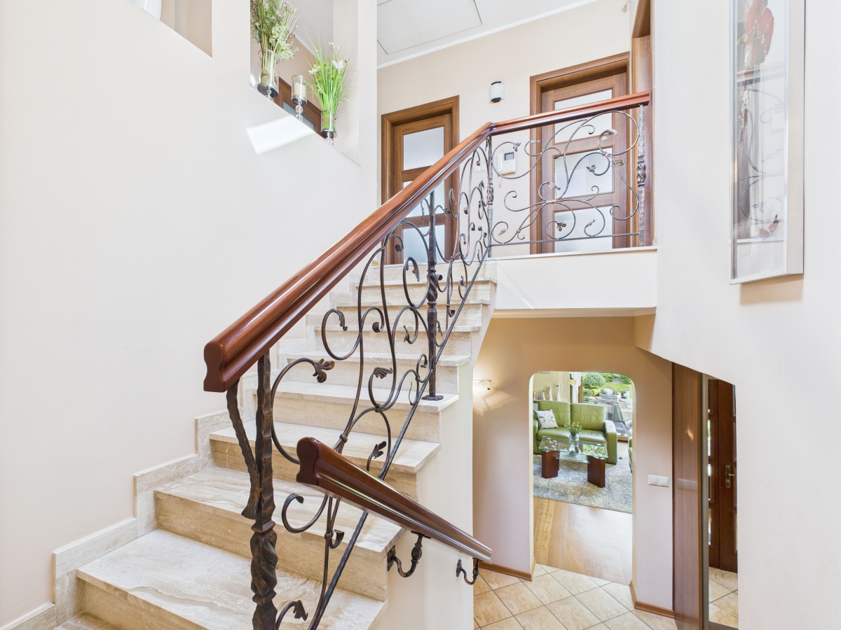 Na piętro domu prowadzą nas piękne marmurowe schody z balustradą wykonaną z metaloplastyki. W skład piętra domu wchodzą trzy sypialnie (dwie z nich mają wyjścia na wspólny balkon), pokój kinowy, łazienka z wanną oraz suszarnia.
