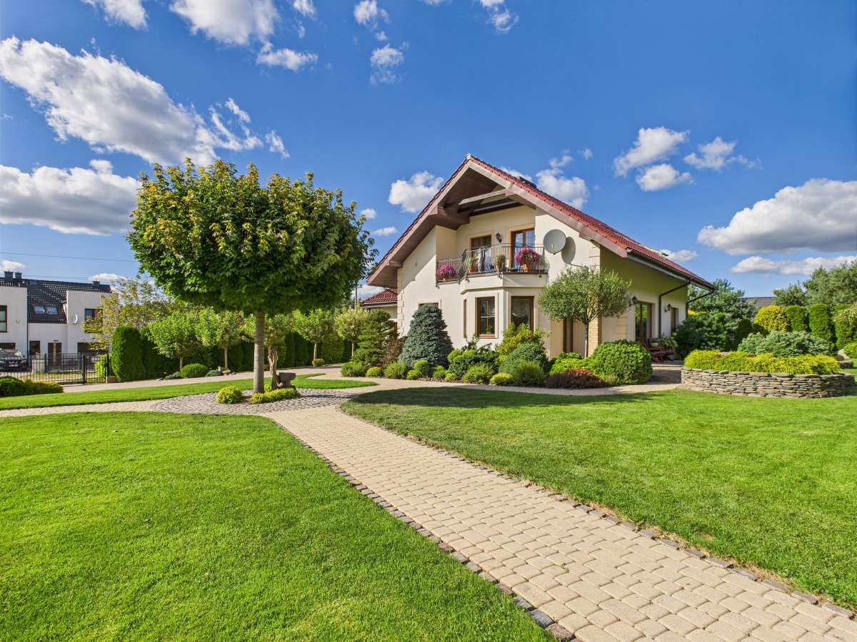 Przed domem jest obszerny podjazd wyłożony kostką brukową. Schody prowadzące do domu oraz taras wyłożone są kamieniem naturalnym, co daje duże poczucie stabilności nawet w mokre lub mroźne dni.