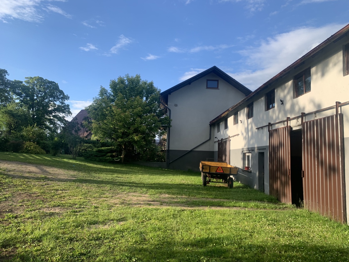 Dom jednorodzinny wraz z halami po byłym zakładzie ślusarskim, dodatkowo budynek gospodarczy w którym znajduje się stajnia na dwa konie oraz szopa drewniana. Całość na ogrodzonej działce o pow. 9960 m2 na ktorejznajduje się staw, ogród, pastwisko. Dom podłączony do kanalizacji i wodociągu gminnego ale posiada również własną studnie głębinową. Możliwość hodowli koni, alpak.