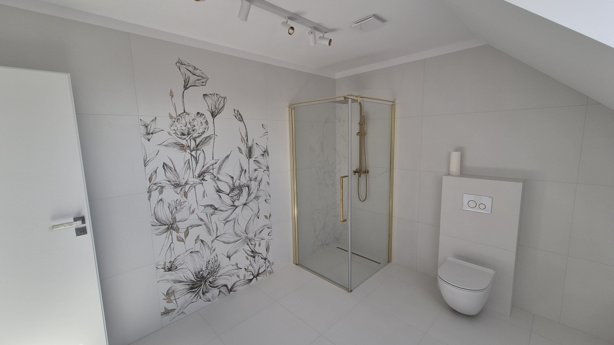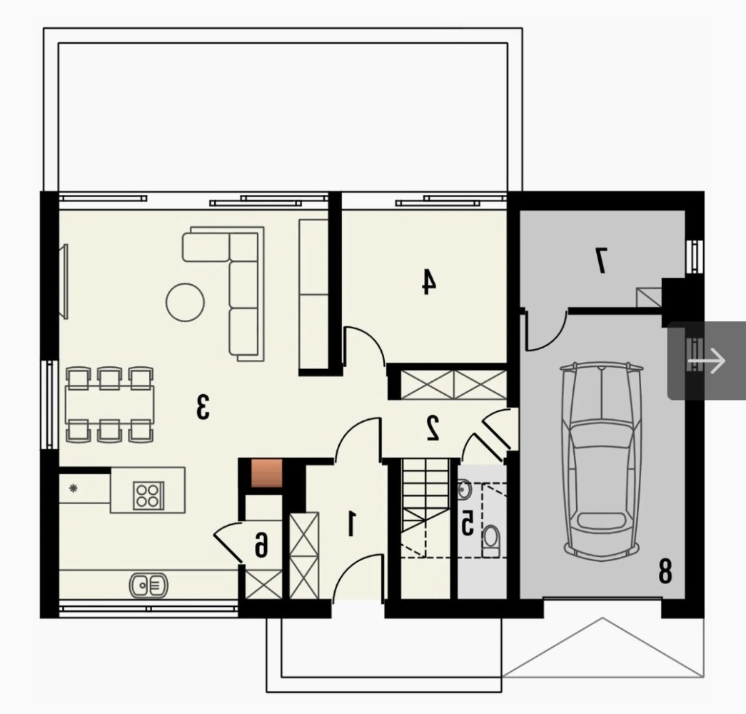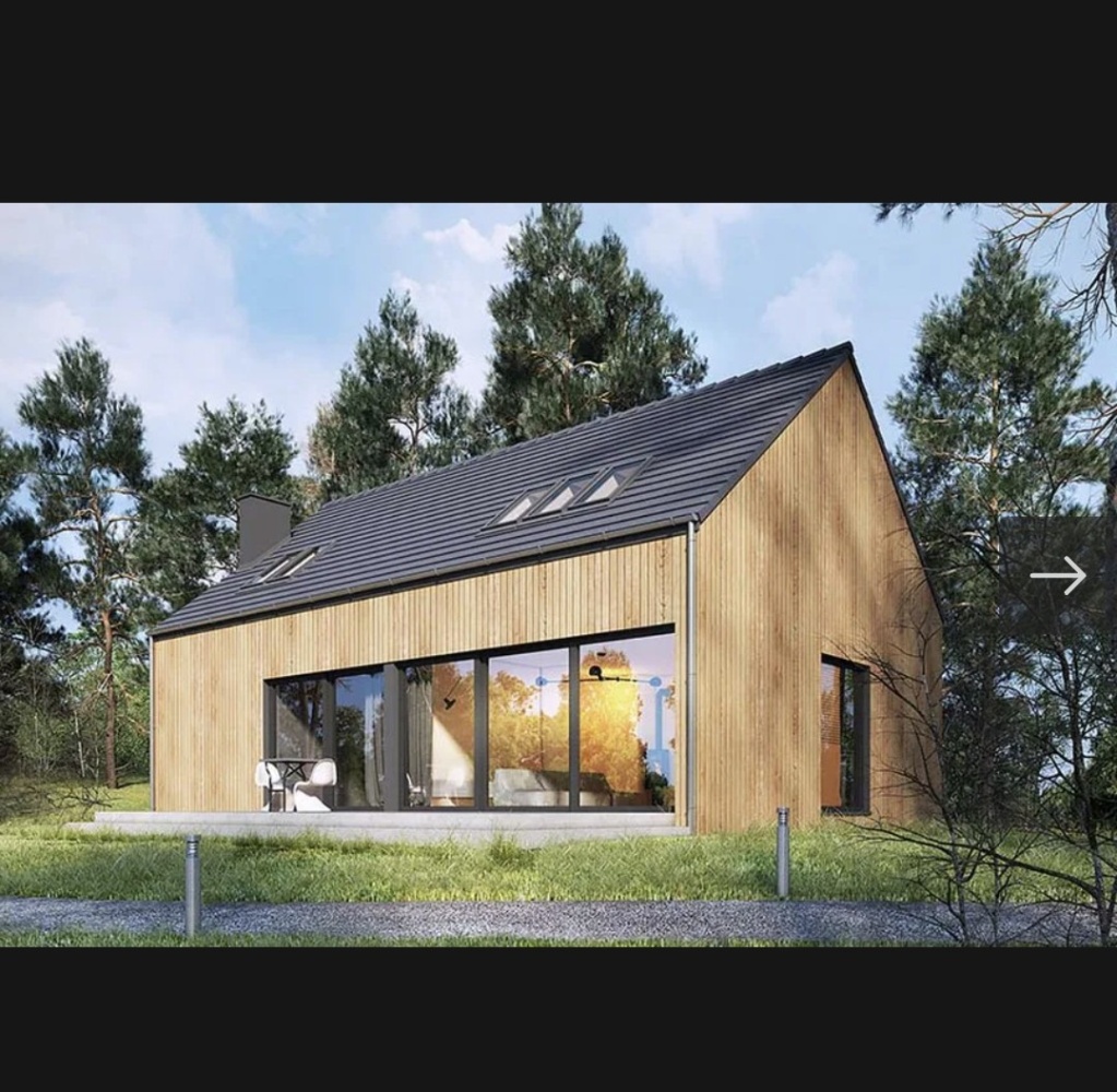Nowoczesna bryła typu stodoła, duże przeszklenia, garaż w bryle budynku. Na parterze salon z kuchnią, dodatkowy pokój i WC; na poddaszu 3 sypialnie, łazienka, garderoba i pralnia.