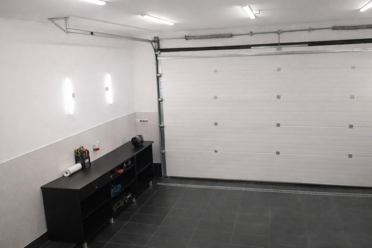 Garaż dwustanowiskowy z toaletą i drewnianymi schodami prowadzącymi do dwóch pomieszczeń nad garażem.