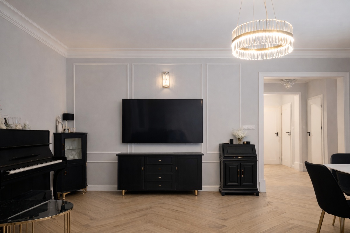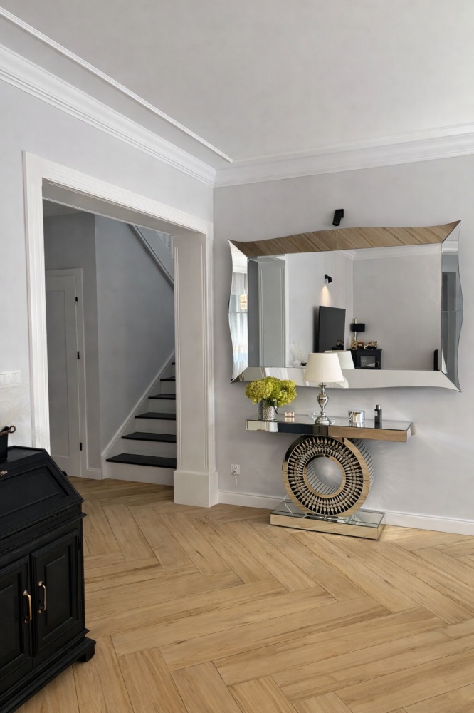 Przestronny, doświetlony salon z aneksem kuchennym to klasyka w nowoczesnym i wyrafinowanym wydaniu. Zastosowano prostą neutralna bazę: jasne podłogi (gresy) i ściany oraz kilka antycznych, mocnych akcentów. Sufity zdobi sztukateria.