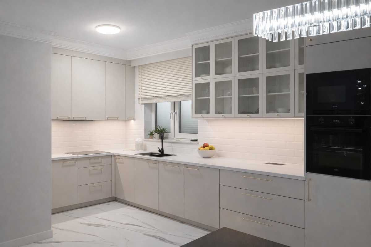 Stonowana, tradycyjna kuchnia nadaje szyku i elegancji. Przeszklenia w witrynach nadają lekkości i wspaniale eksponują szkło bądź porcelanę.