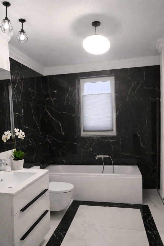 Łazienka w tonacji czarno białej z gresami imitującymi marmur, – z wanną oraz natryskiem. Stylizowane baterie.