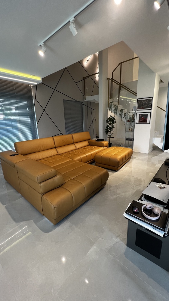* 3 metrowa kanapa w salonie na zamówienie z naturalnej skóry bydlęcej wraz z elektrycznie regulowanym siedziskiem