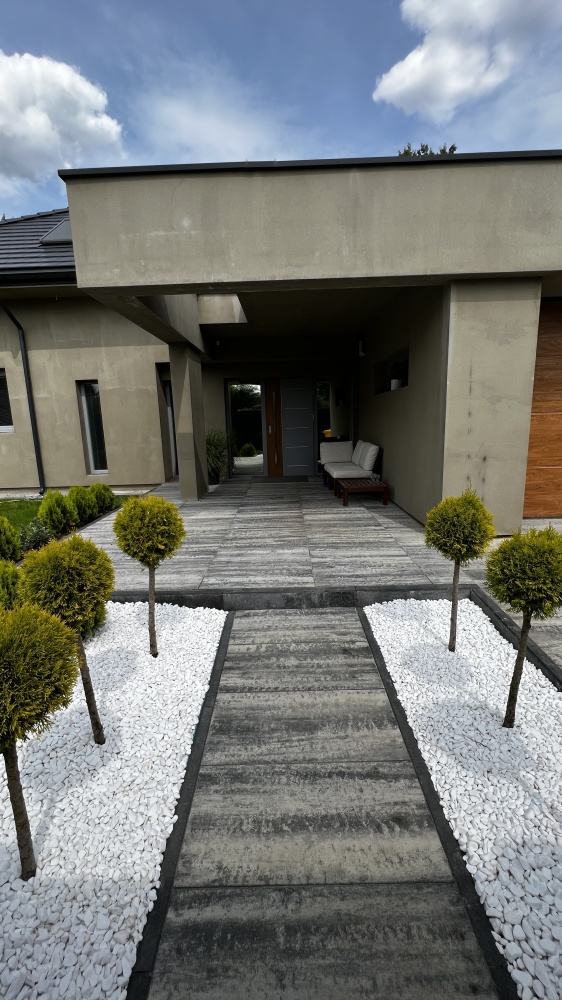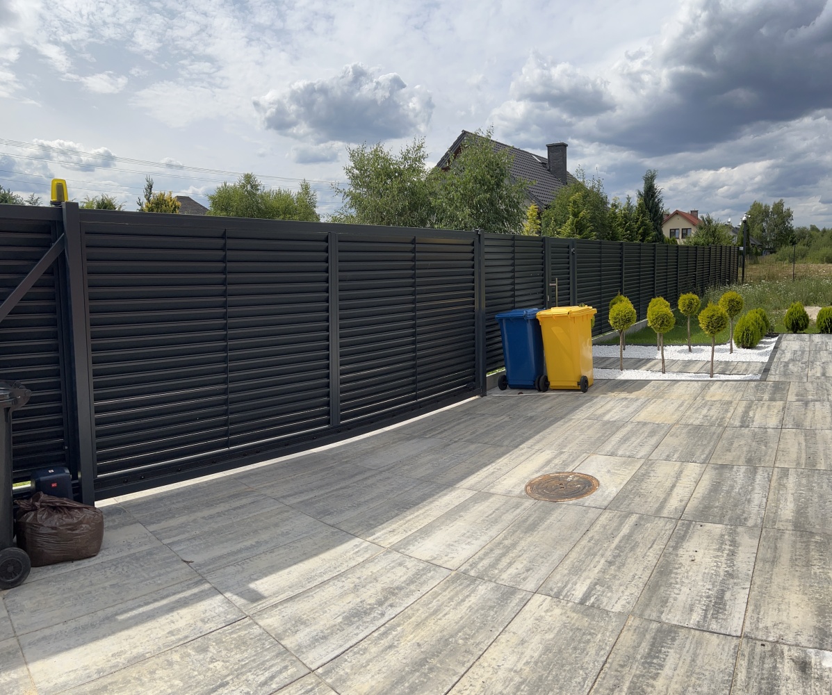 * front wykonany z ogrodzenia Louver tzw żaluzja wraz z 6 metrową bramą przesuwną, furtką z wideomofonem oraz elektrozaczepem