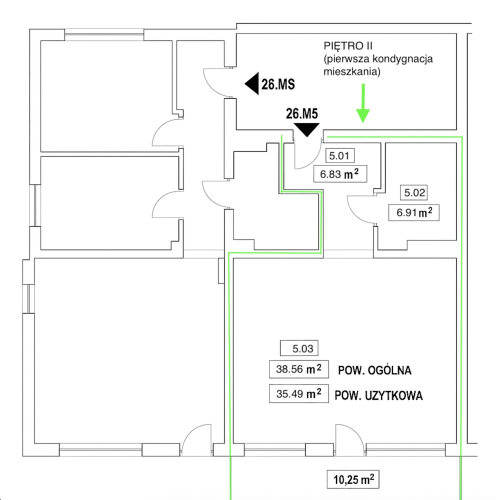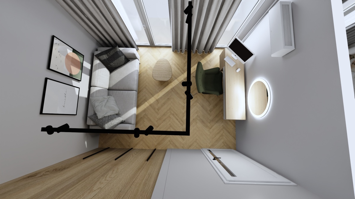 Przestrzeń open space – 35,49 m² (możliwość wydzielenia dwóch pokoi, garderoby)