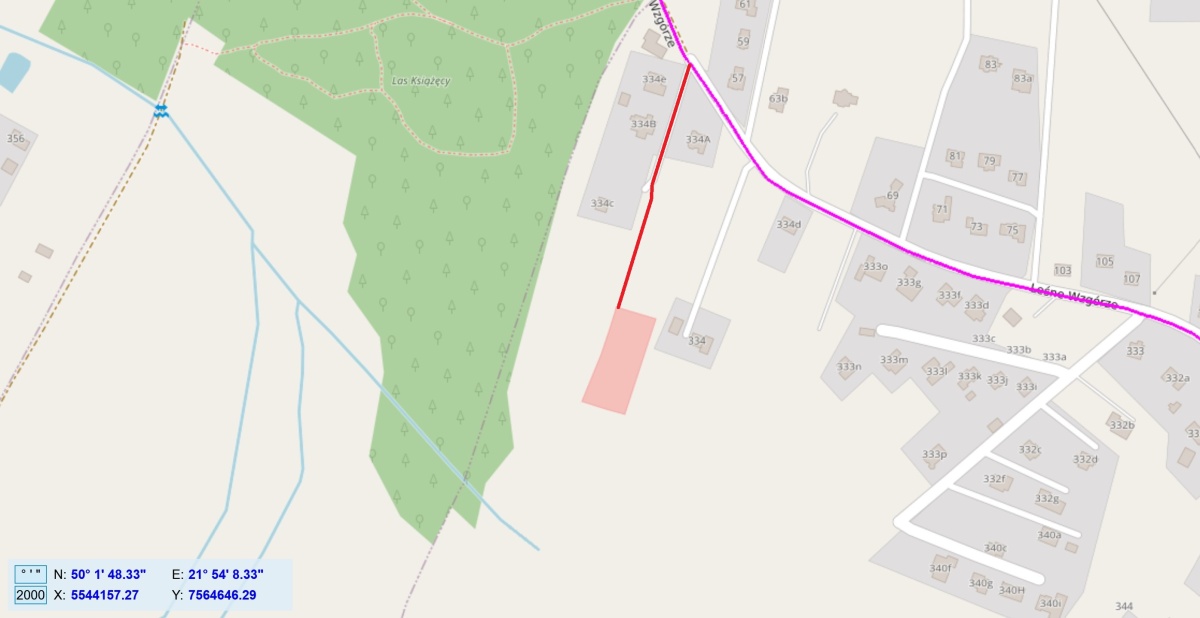 Dojazd drogą służebną od strony ul. Leśne Wzgórze (wpisana do KW, na mapce zaznaczona kolorem czerwonym).