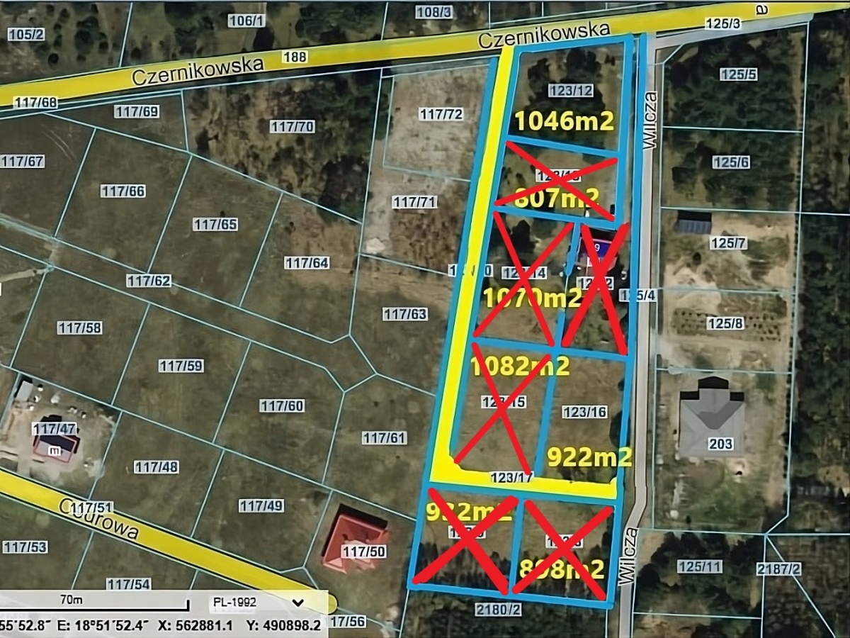 Działki przekreślone czerwonym krzyżykiem są już sprzedane.