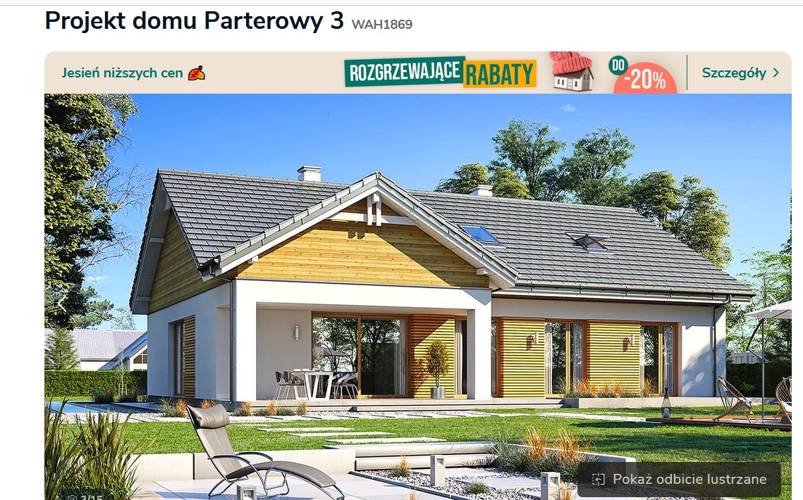 Projekt domu z garażem dwustanowiskowym pracowni MGProjekt z Warszawy. Nazwa "Parterowy 3" adoptowany do wymiarów działki tj. powiększony w części mieszkalnej i garażowej do wym. 1700 x 1110 a garaż 826 x 694 połączony z bryłą budynku.. Pow. b.m. -170 m2 plus poddasze do zagospodarowania a pow. garażu 42 m2 (po obrysie wewnętrznym). Zmieniono usytuowanie wjazdu do garażu na przedłużoną ścianę boczną.
