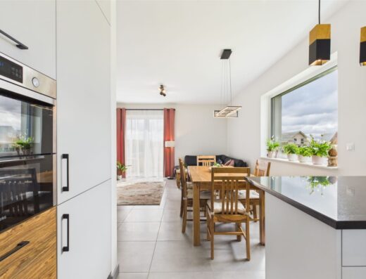 Dom zachwyca elegancką, geometryczną bryłą z dużymi przeszkleniami, które nie tylko pięknie doświetlają wnętrza, ale też otwierają dom na ogród i krajobraz za oknami. Wysokie na 3 metry sufity potęgują poczucie przestronności. Nieruchomość składa się z 7 pokoi, idealnych do zaaranżowania stref wypoczynku, pracy czy spotkań towarzyskich.
