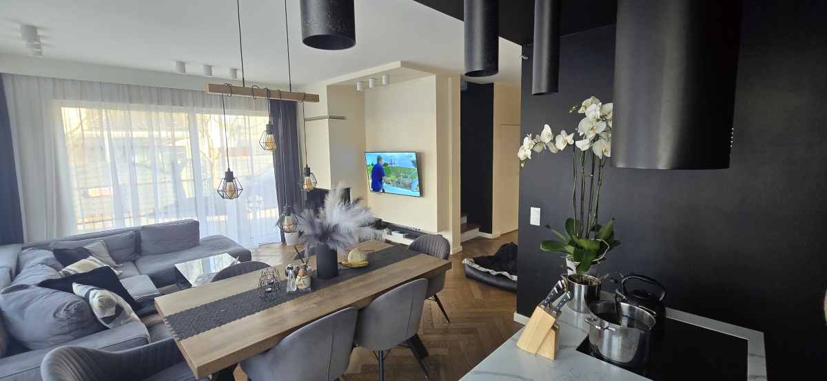 Strefa dzienna to elegancka, pełna światła przestrzeń z kominkiem, który buduje klimat wnętrza i podkreśla jego charakter. Duże przeszklenia otwierają salon na ogród – prywatną, zieloną strefę relaksu.