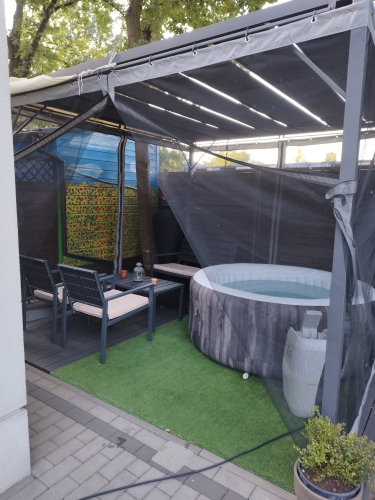 Z boku ogródka obok mieszkania znajduje się domek gospodarczy (np. na rowery) o powierzchni 6m2 oraz taras z deski kompozytowej z pergolą – powierzchnia tarasu 10m2.