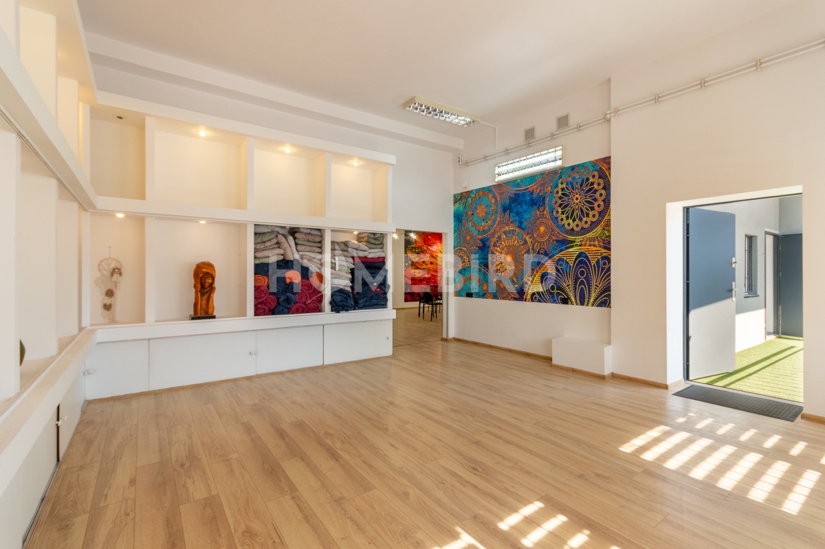 Na parterze znajduje się wyodrębniony lokal usługowy z dwoma wejściami (po schodach, połączone loggią, od strony głównego placu przed budynkiem), o powierzchni 196,27m2 składający się z następujących pomieszczeń: