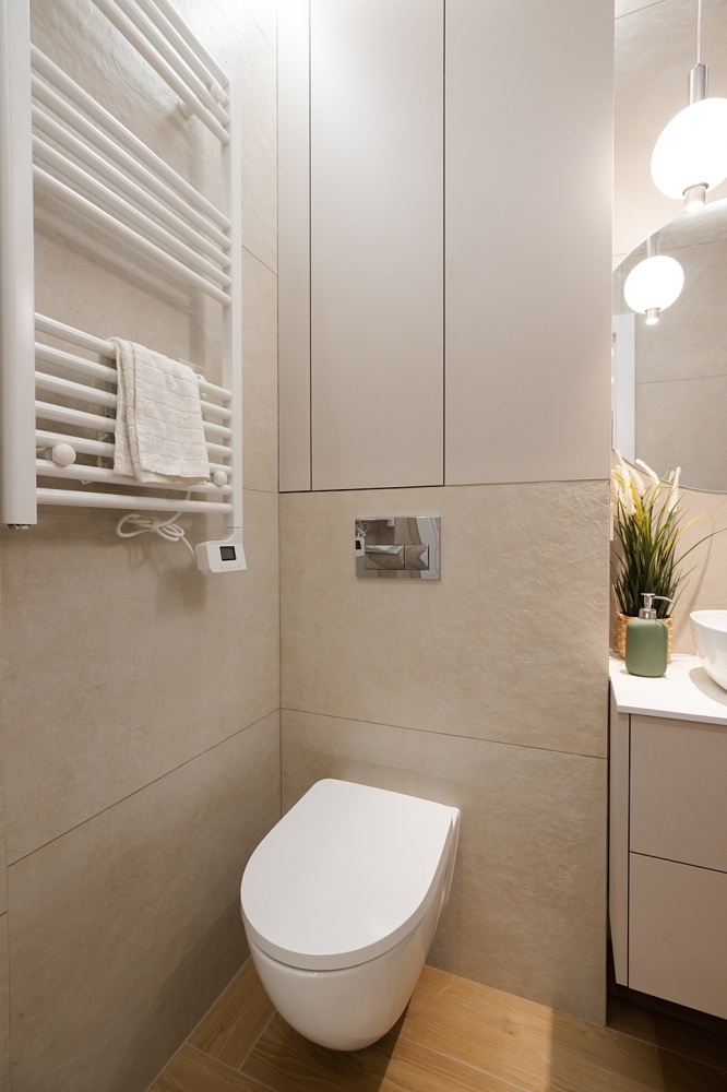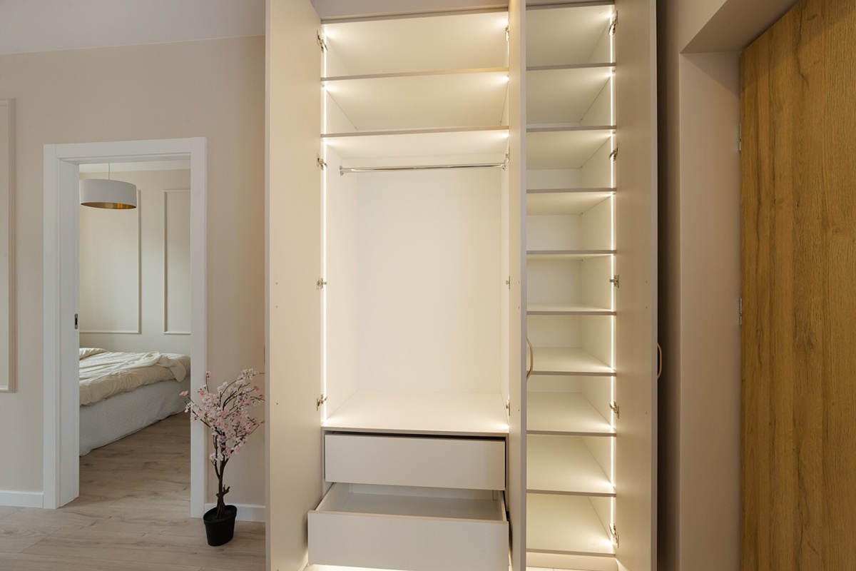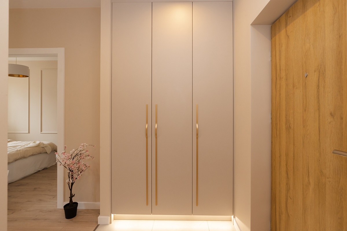– Garderoba w sypialni i duża szafa w przedpokoju, pozwalają wygodnie zorganizować przestrzeń do przechowywania.