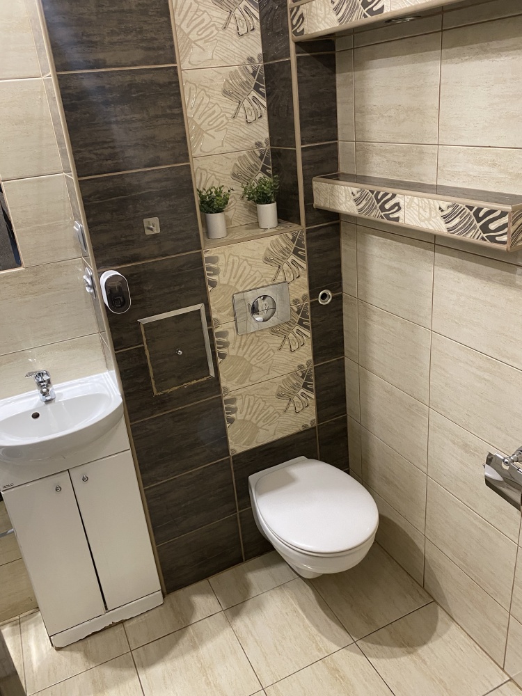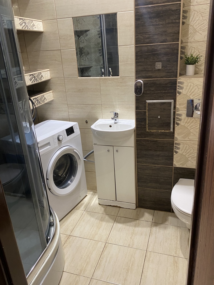 3) Łazienka z WC o powierzchni 2,80m2 w płytkach . Na wyposażeniu prysznic oraz pralka