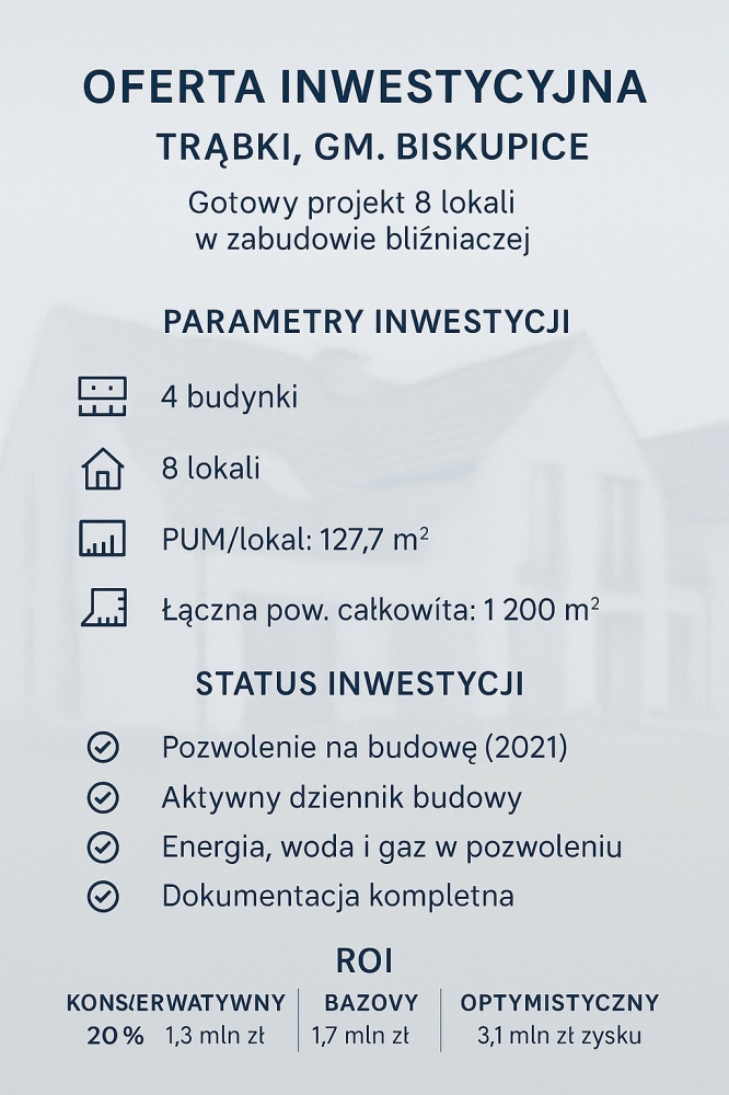 4 budynki w zabudowie bliźniaczej (8 lokali po ok. 110 m² PUM),