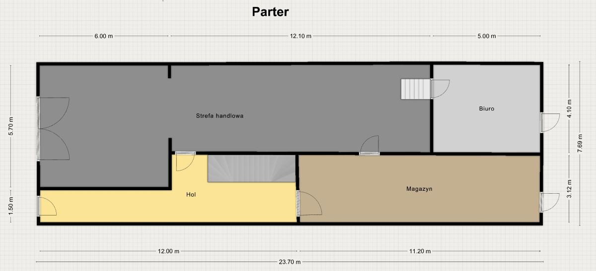 * Układ: duża sala, dodatkowe biuro oraz dwa magazyny.