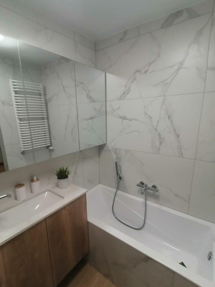 Łazienka : wanna, pralka, zabudowa na wymiar z granitowym blatem umywalka podwieszana, szafki z lustrem
