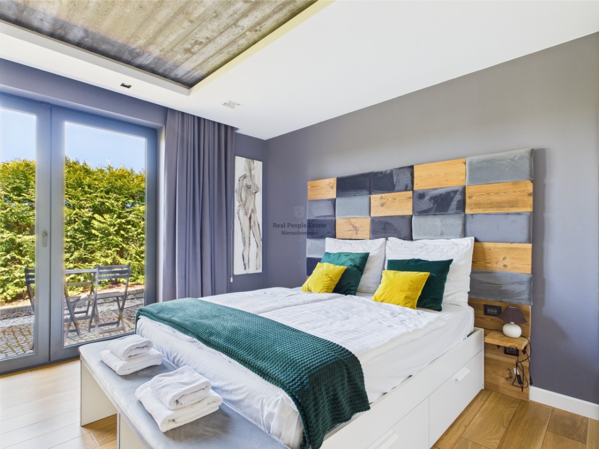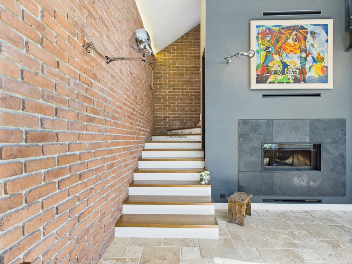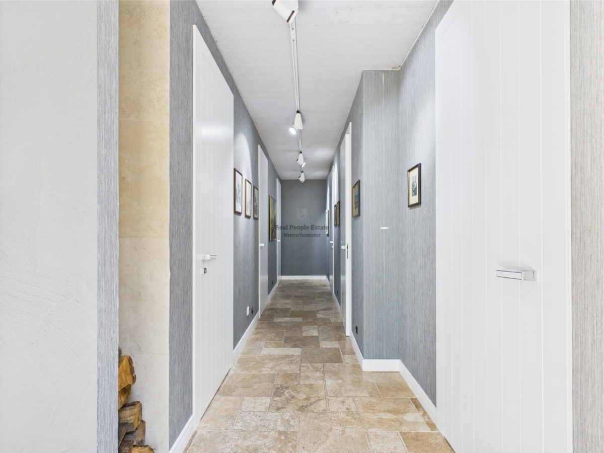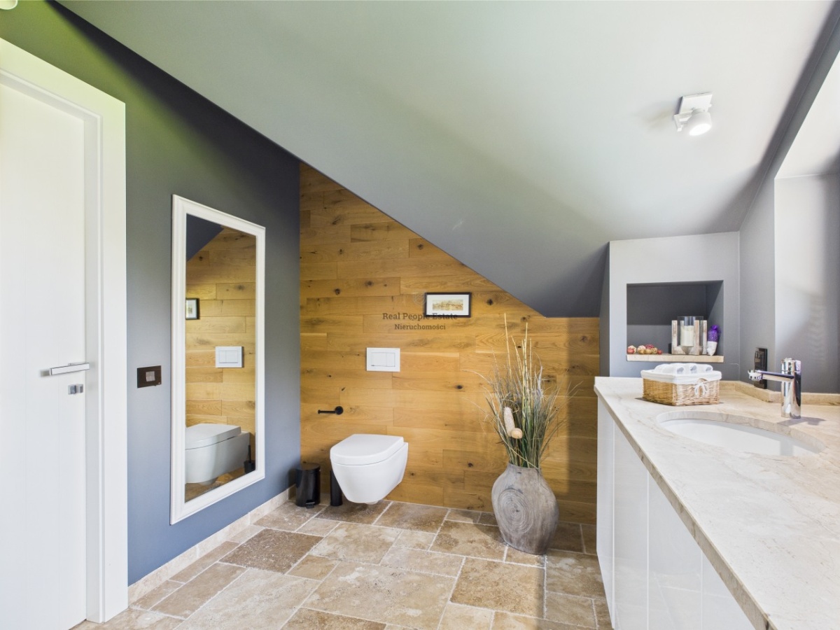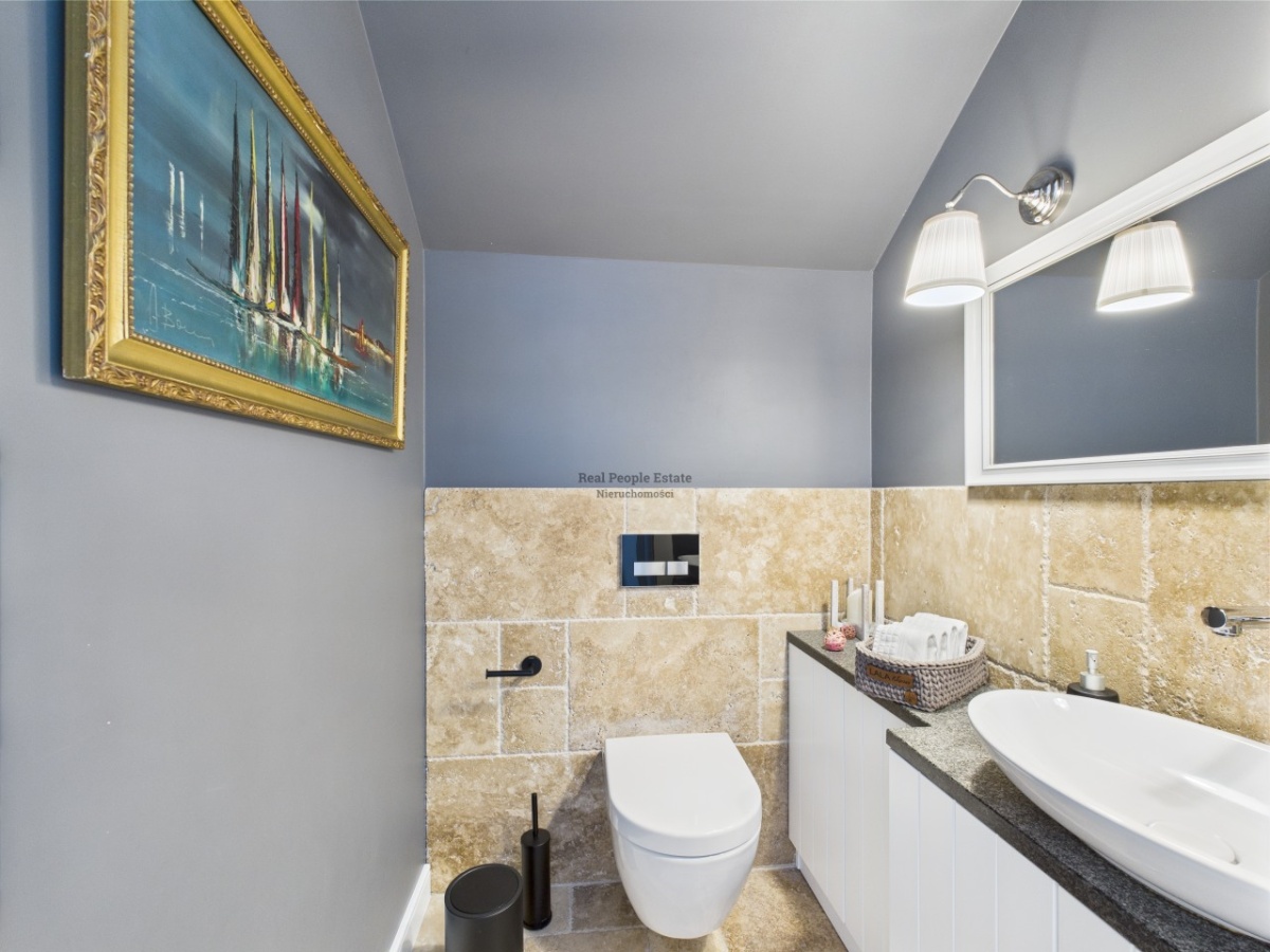 Dom o powierzchni użytkowej 195,33 m² (całkowita 213,93 m²) został wybudowany w 2018 roku. Funkcjonalny układ oferuje 4 sypialnie, przestronny salon z kominkiem połączony z nowoczesną kuchnią, 2 łazienki oraz dodatkową toaletę i 2 pomieszczenia gospodarcze. Całość została wykończona w bardzo wysokim standardzie – podłoga w pokojach wyłożona panelami drewnianymi, pozostałe pomieszczenia kamieniem naturalnym.
