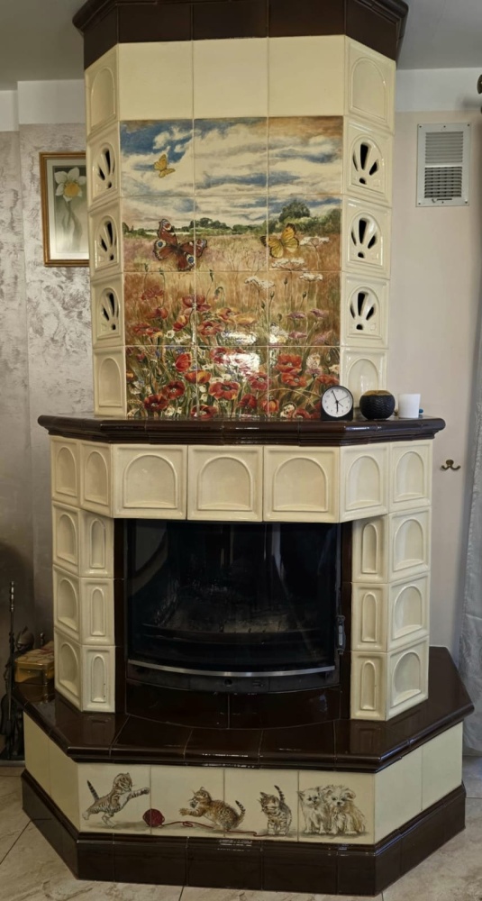 • stylowy kaflowy kominek z ręcznie malowanymi kaflami i rozprowadzeniem ciepła na poddasze,