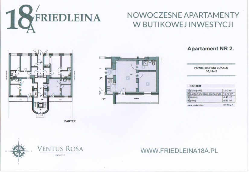 Mieszkanie ma pow.35,18 m2. Pokój z aneksem kuchennym : 19,79 i wyjściem na taras , sypialnia 9,49 m2, łazienka ( 4,40 m2 ) oraz przedpokój z miejscem na 2 -drzwiową szafę. Mieszkanie 1 poziomowe. Od strony wewnętrznego dziedzińca.