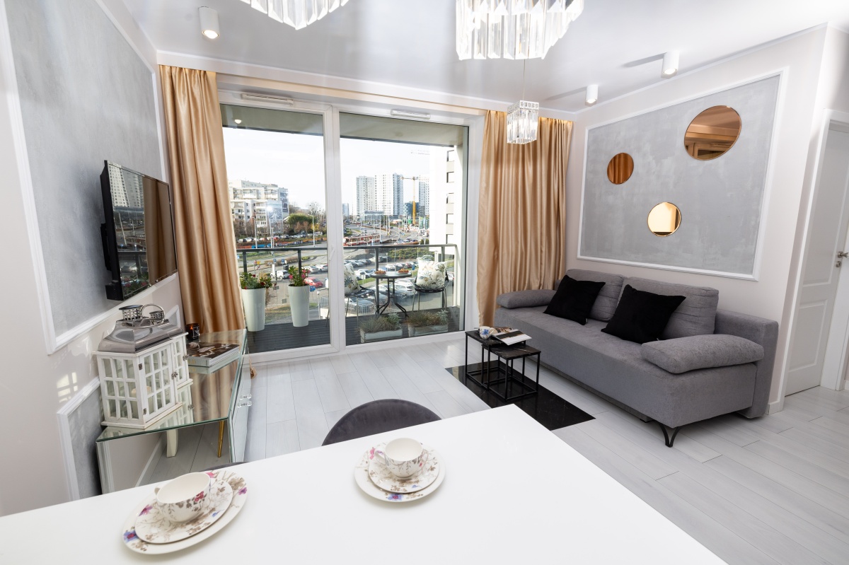 Prezentowany apartament otwiera przedpokój, którego atutem jest obszerna szafa wnękowa, dyskretnie ukryta za przesuwanymi drzwiami z mlecznego szkła. Przedpokój zaprasza do eleganckiego i dobrze doświetlonego zachodnim słońcem salonu oraz przytulnej sypialni i stylowej łazienki. Od razu widać, iż we wnętrzu rządzi szlachetna, stonowana i delikatnie zróżnicowana kolorystyka, z dominującym beżem ścian, szarością betonów i tkanin, bielą mebli, co w połączeniu z kryształowymi i złotymi dodatkami inspirowanymi stylem glamour stało się znakiem rozpoznawczymi prezentowanego apartamentu.