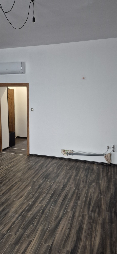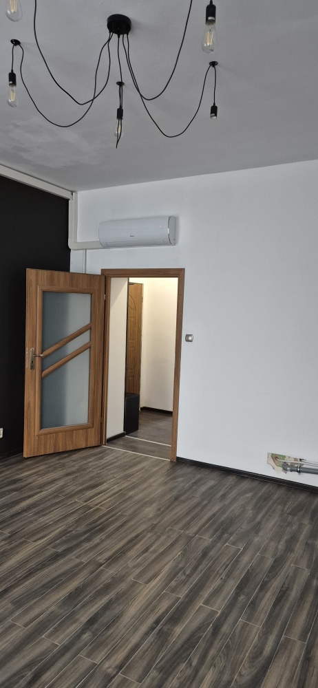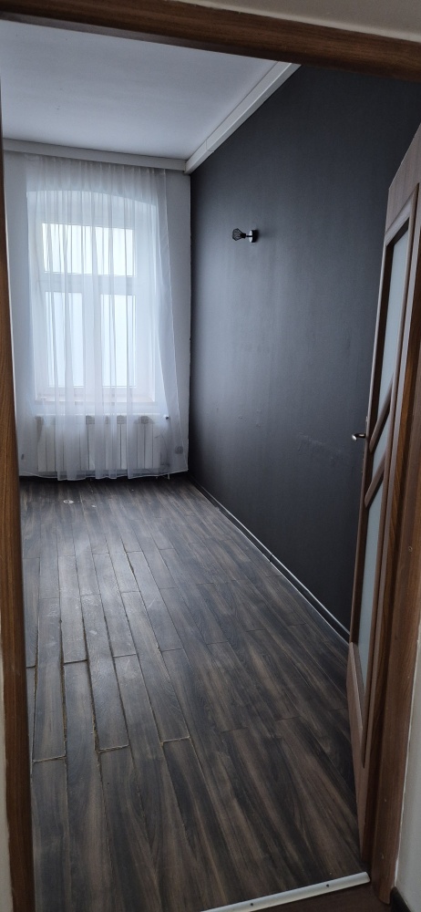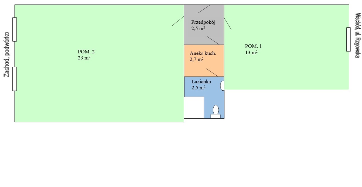 Mieszkanie składa się obecnie z dwóch pomieszczeń głównych – 25m2 i 18m2 oraz przedpokoju i łazienki. W większym pokoju wyprowadzone media pod aneks kuchenny.