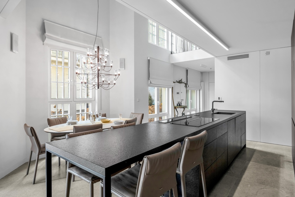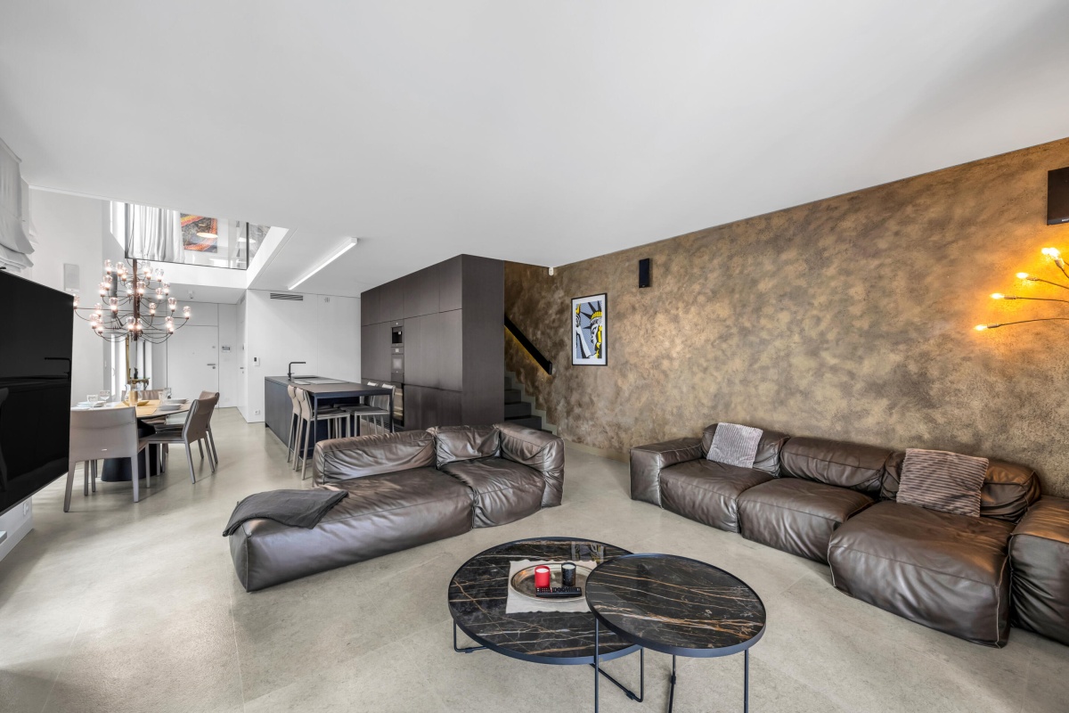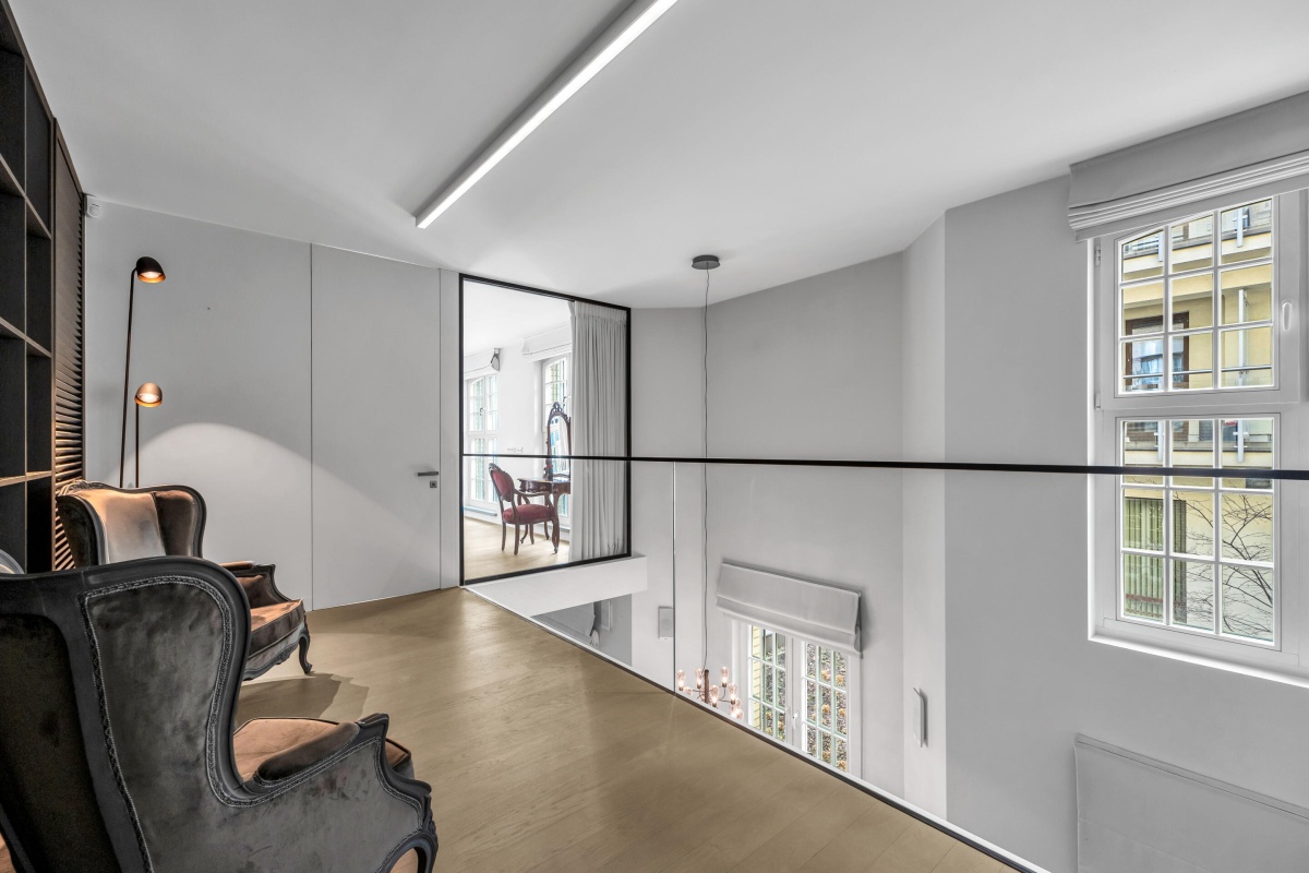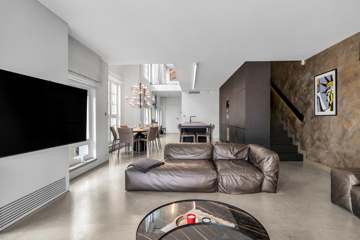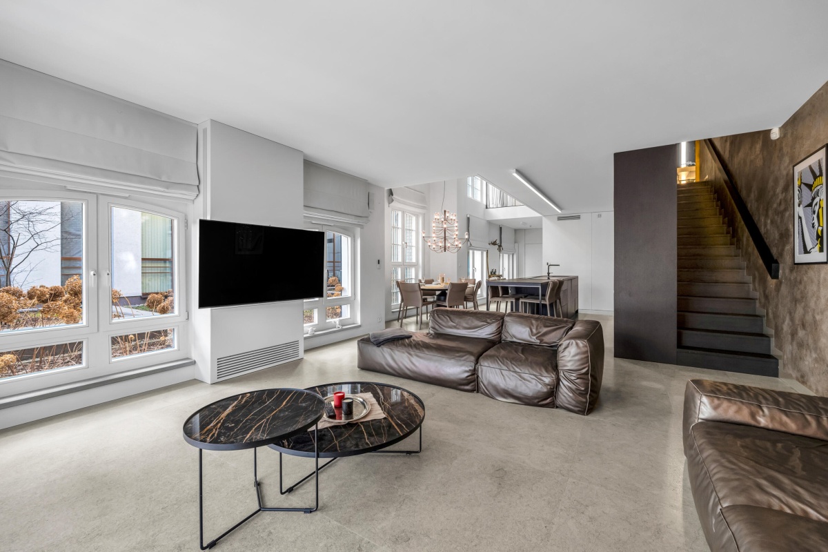 Apartament 134 m² w kameralnym, dwupoziomowym budynku z ogrodem 87 m² i antresolą o wysokości 5,5 m. Położony w cichej, drugiej linii zabudowy.