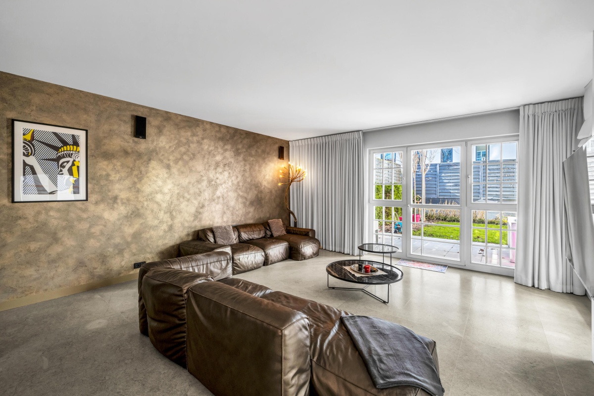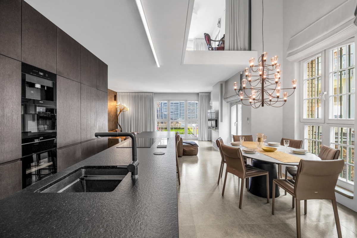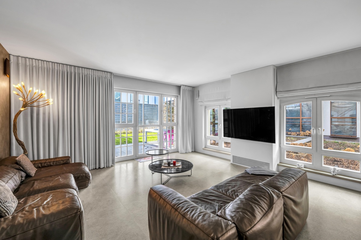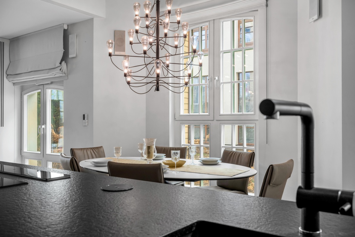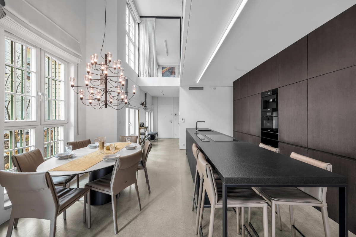 Apartament 134 m² w kameralnym, dwupoziomowym budynku z ogrodem 87 m² i antresolą o wysokości 5,5 m. Położony w cichej, drugiej linii zabudowy.