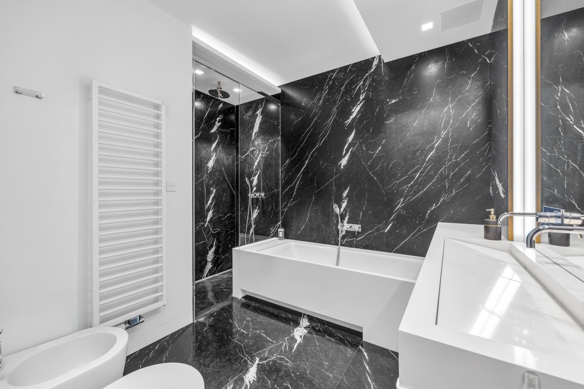 Łazienka z wanną, prysznicem, wbudowanym systemem audio.