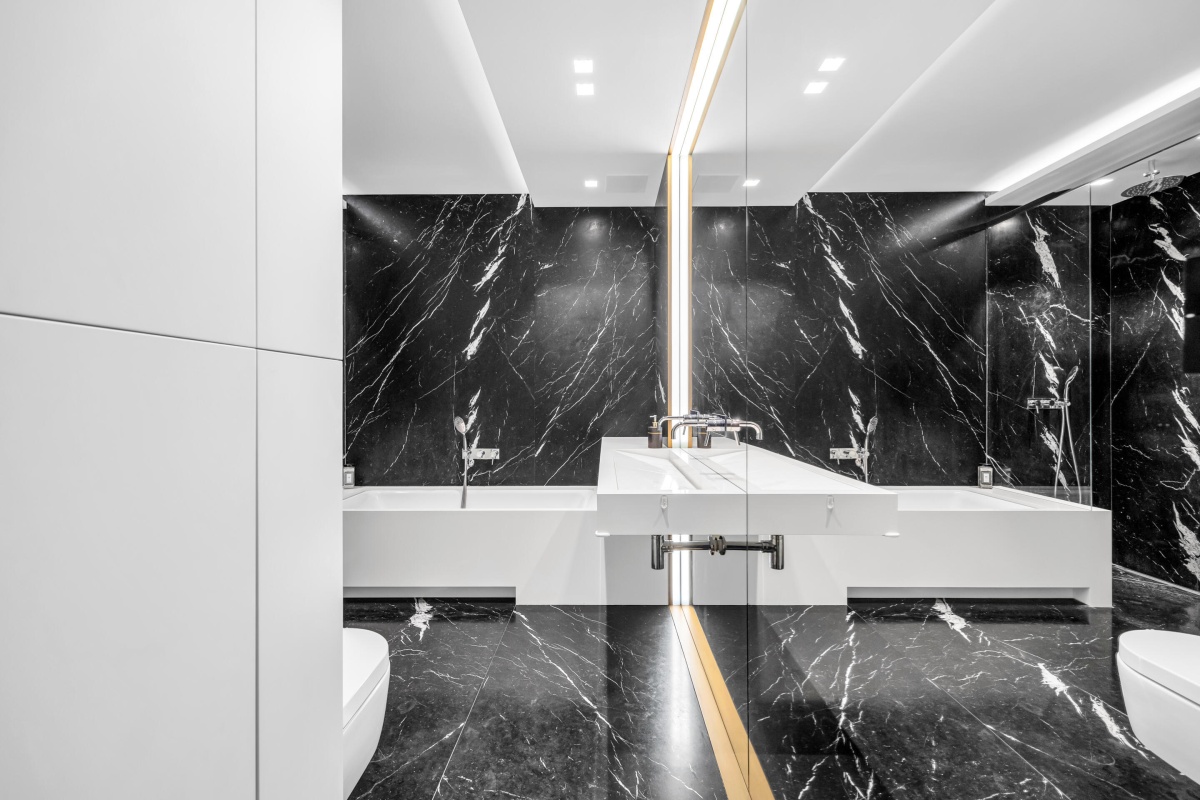 Sprzęt Miele, wykończenie marmurem i dębem.